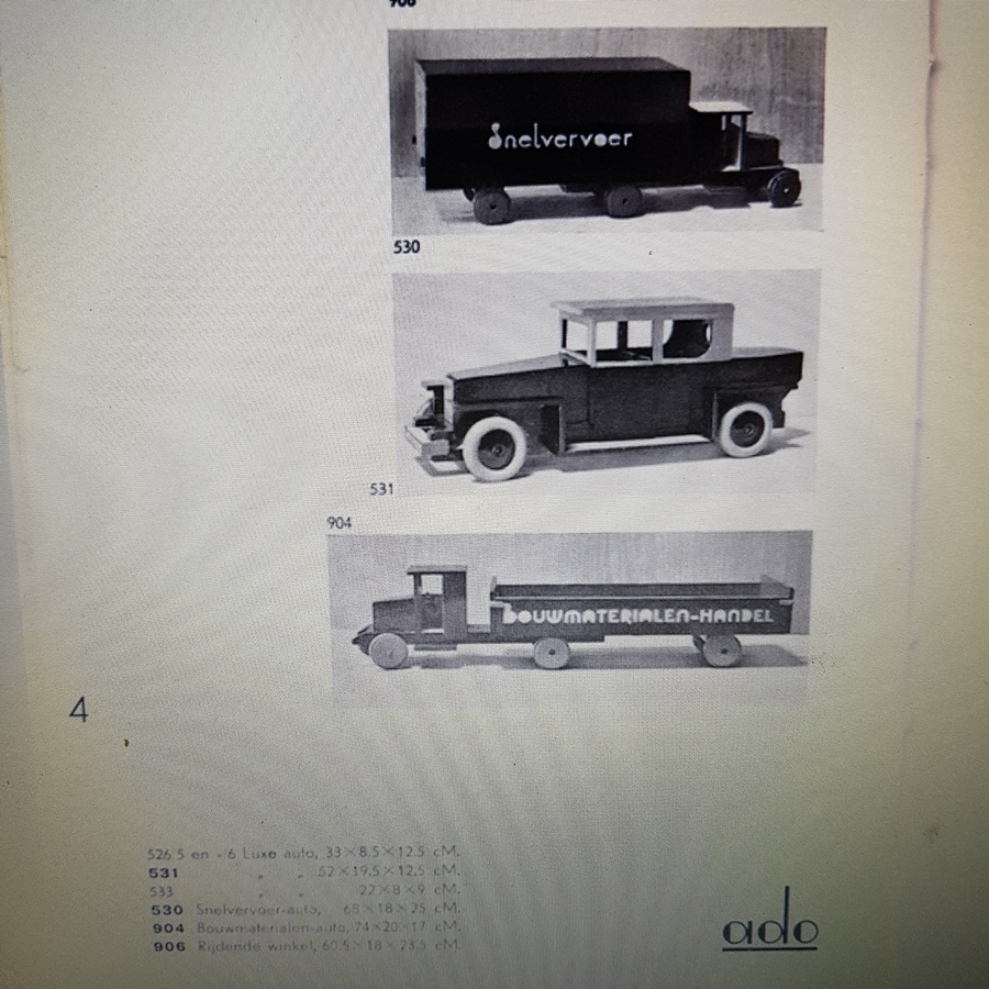 Houten "Luxe 2-deurs auto" van ADO, ontwerp: Ko Verzuu. Nederland 1932. ADO: Arbeid door onvolwaardigen. Dit model auto staat in de catalogus blz. 4 ( adospeelgoed.eu) van 1932. ( zie foto's) |