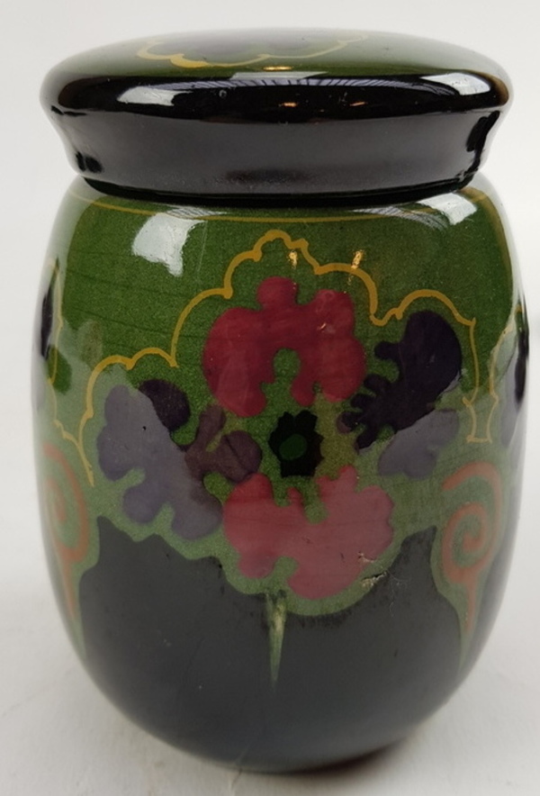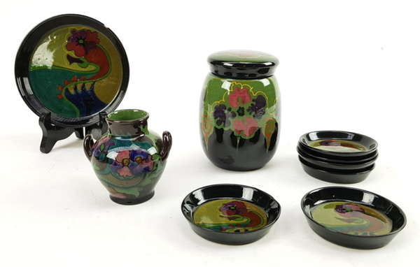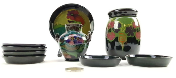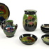 | Afmetingen | Hoogte dekselpot 12 cm en doorsnede 8 cm, vaasje hoogte 8 cm en doorsnede 7 cm, schotel doorsnede 13 cm en schotels 6 stuks doorsnede 8 cm. |