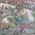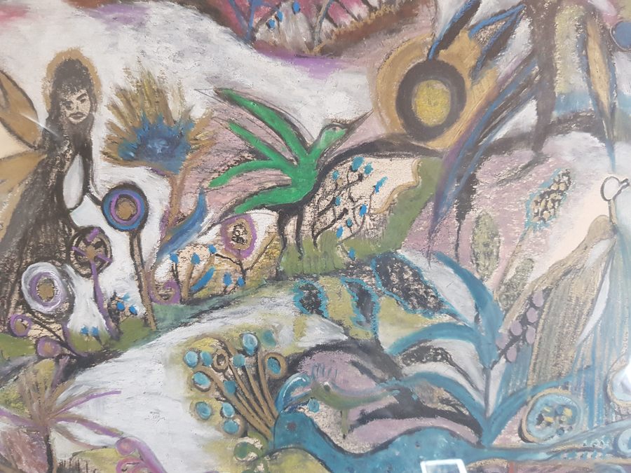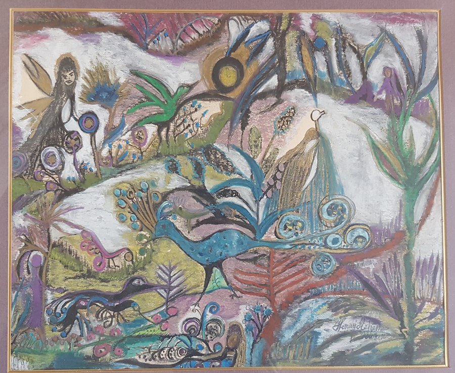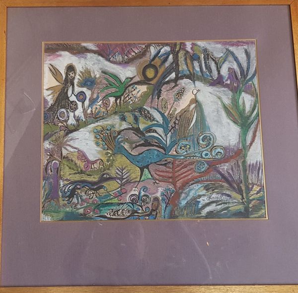 Gouache, fantasielandschap, vogels en figuren door Henny Arkema- Niezen.