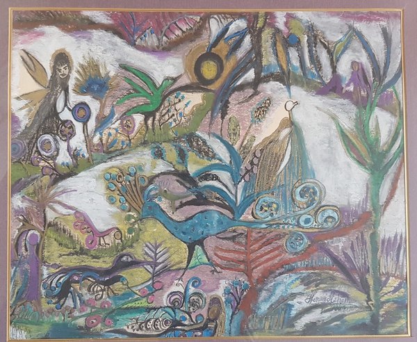 Gouache, fantasielandschap, vogels en figuren door Henny Arkema- Niezen( 1901 - 1984). Gesigneerd r.o. |