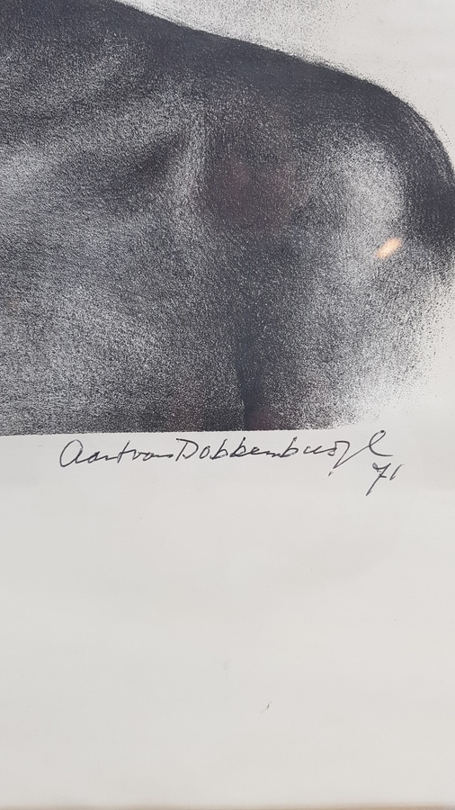 Lithografie 1971. Aart van Dobbenburgh (1899-1988) was een Nederlands kunstenaar en graficus bekend door zijn lithografieën van bloemen, portretten en landschappen. In 1971 maakte hij deze litho op geschept papier en met potlood rechts onder gesigneerd. Het werk is sinds 1971 in bezit van de familie geweest in de originele lijst achter glas. |