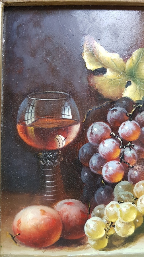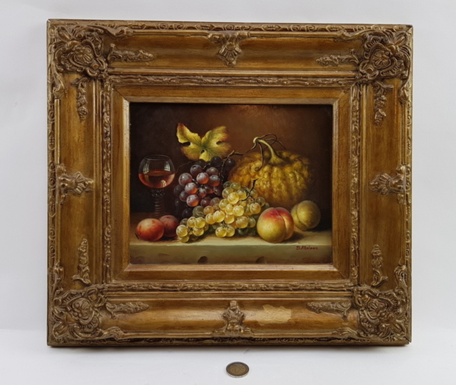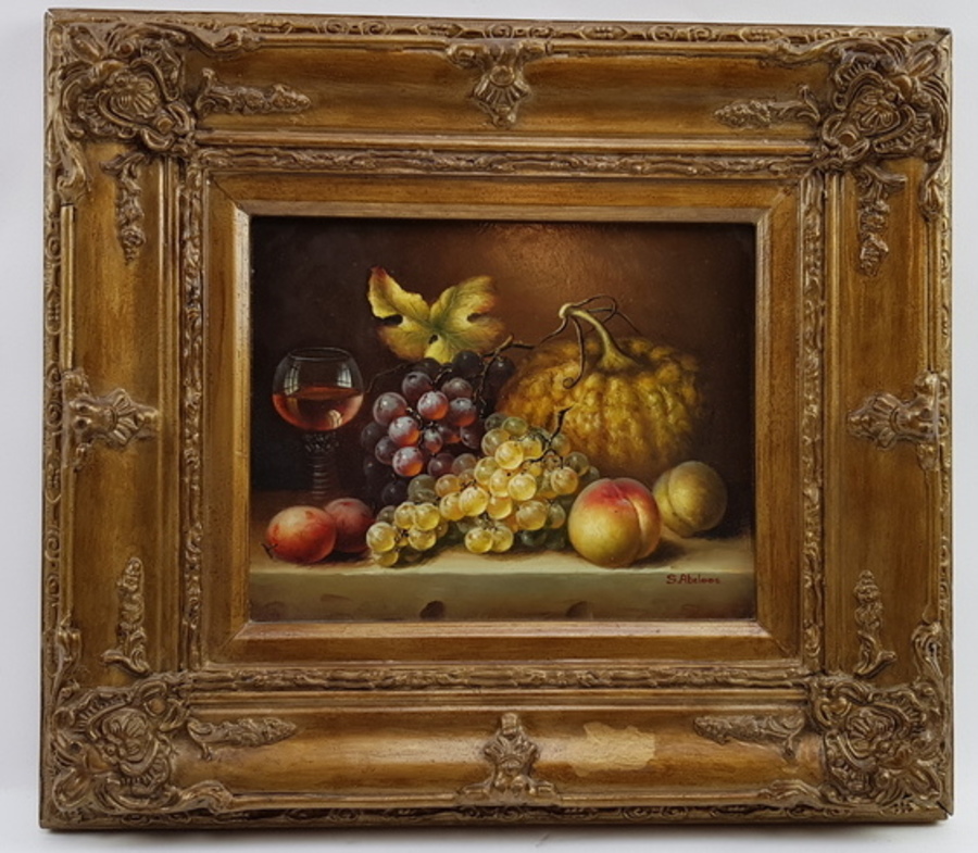 Schilderij, stilleven met fruit, olieverf op paneel, gesigneerd S. Abeloos