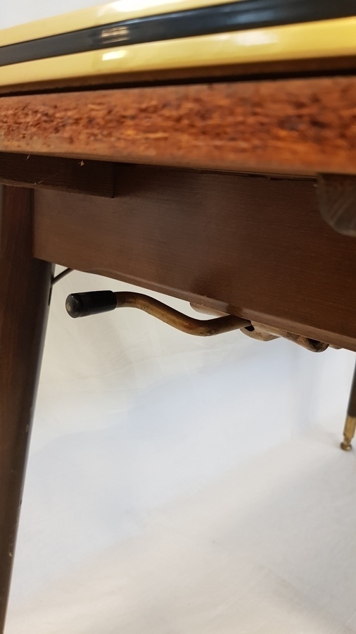 Hout/ glas, vintage uittrektafel. Vermoedelijk Duitsland midden 20e eeuw. Uitklapbaar en in hoogte verstelbaar. |