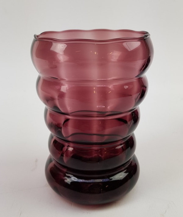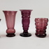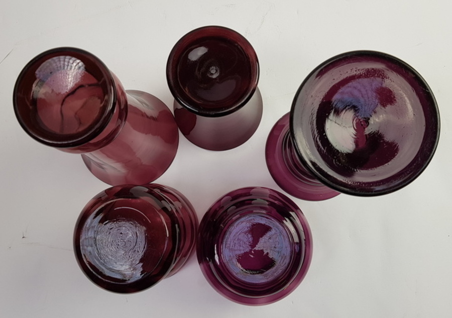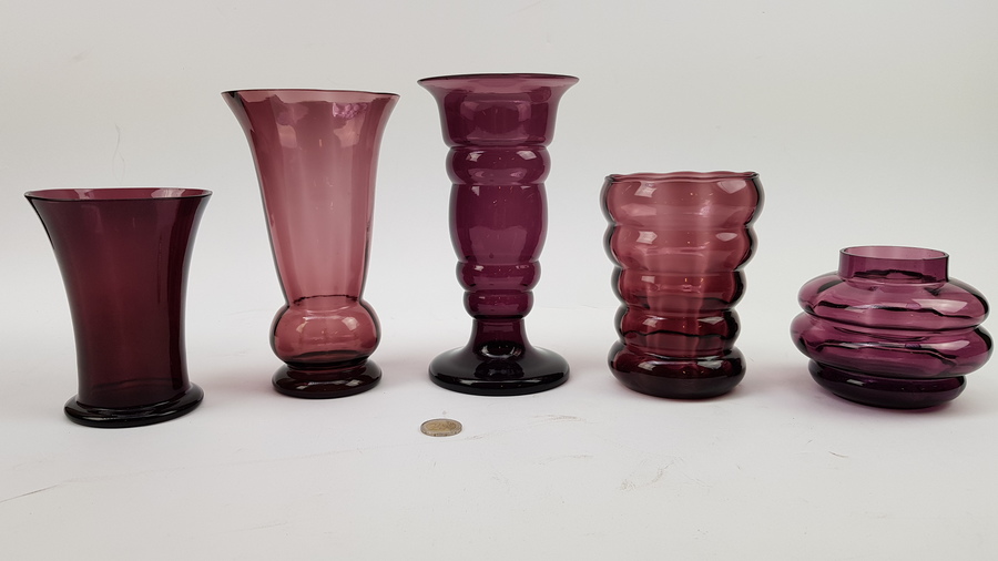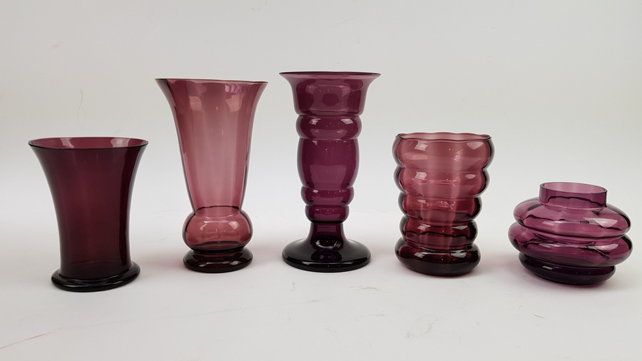 Glasvazen uitgevoerd in paars glas, Boom / Doyen België, eerste helft 20e eeuw, 5 stuks |
