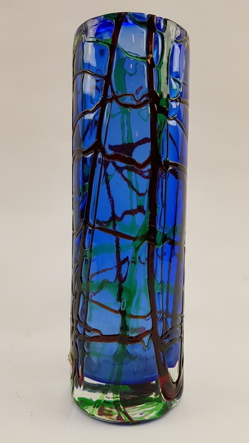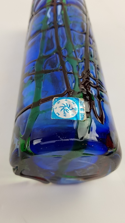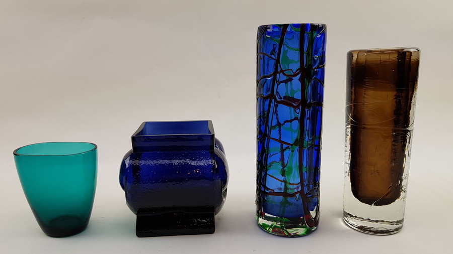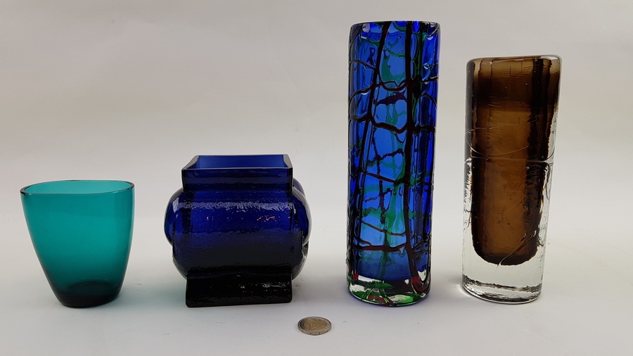 Vier kunstglas vazen, twee met sticker. Europese oorsprong. |