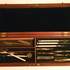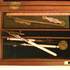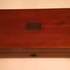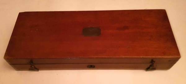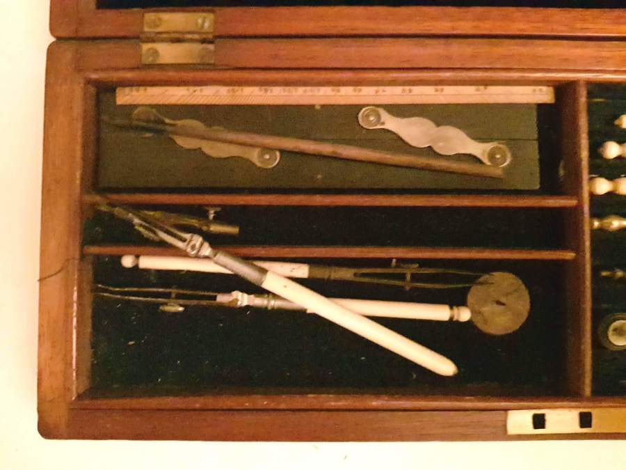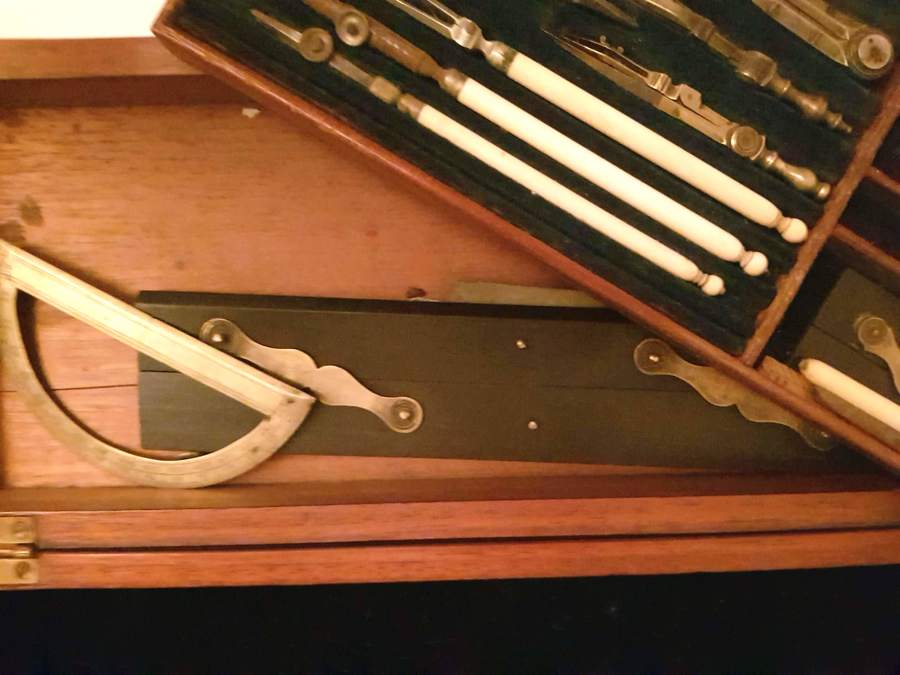 Houten kist met messing pklaatje en scharnieren, gevuld met m,essinge en benen passers en tekengerei hierbij een aantal meetlatten. Ca 1900 |