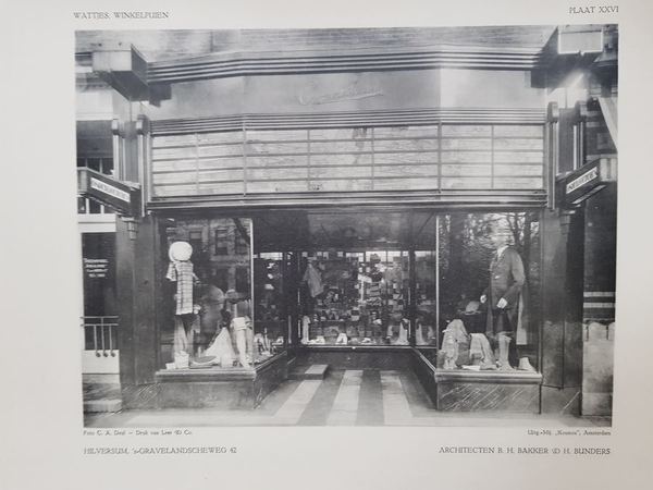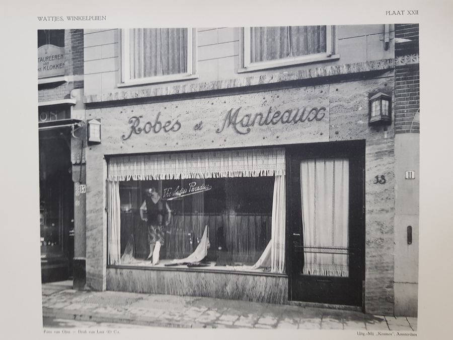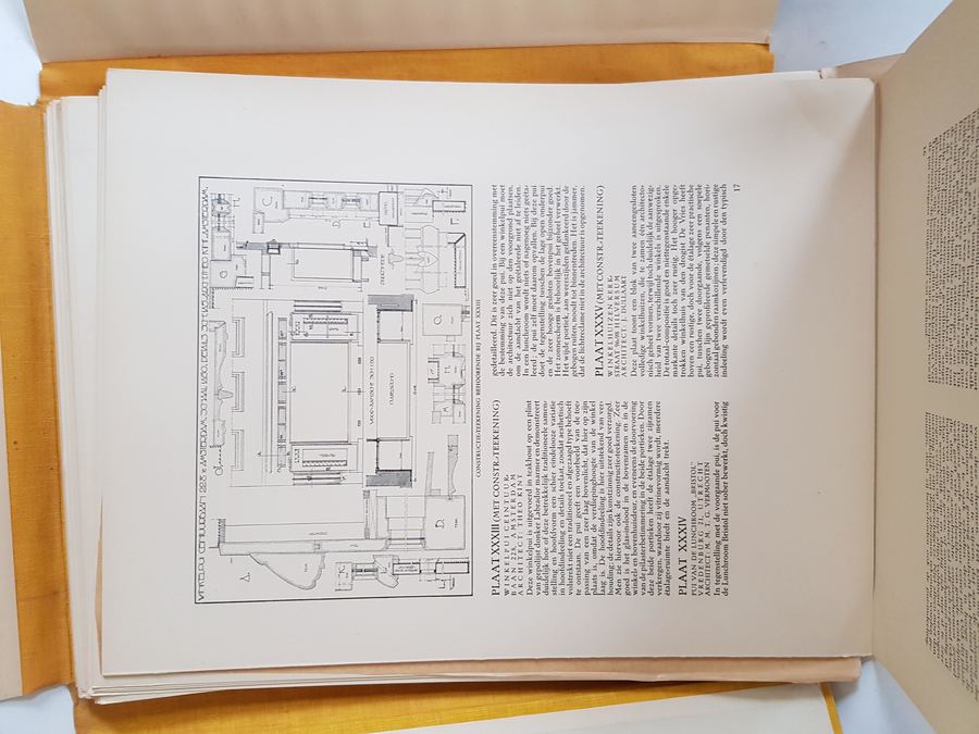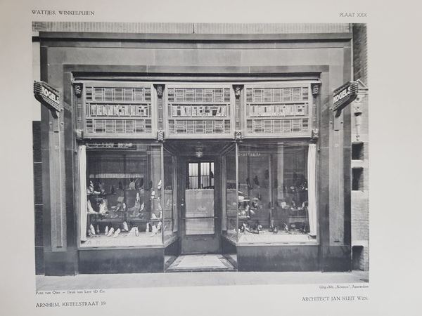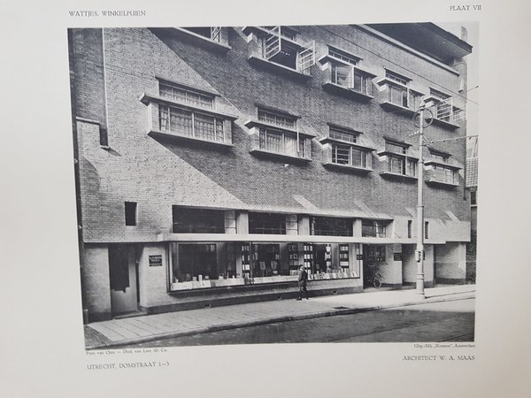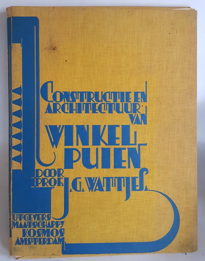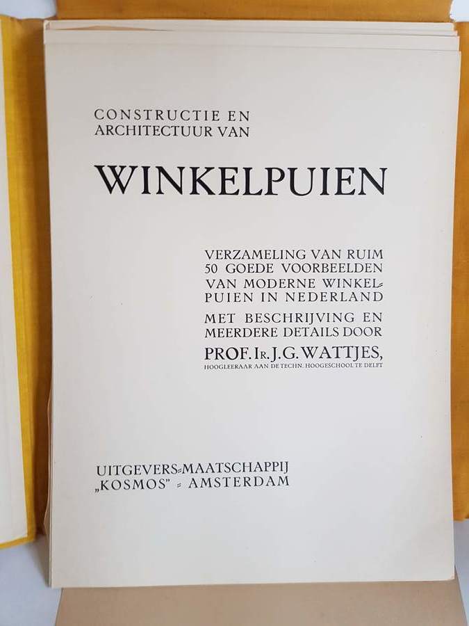 Portfolio met 48 grootformaat foto's van winkelpuien, ontworpen door bekende architecten in de jaren 1920 Prof. J.G. Wattjes - Constructie en Architectuur van Winkelpuien. verzameling van ruim 50 goede voorbeelden van moderne winkelpuien in Nederland. Met beschrijving en meerdere details - Amsterdam, Uitgevers-Maatschappij Kosmos, 1926 - linnen portfolio, viii+24 pp. met inleiding en beschrjvingen (met illustraties) op losse katernen, 48 platen met foto's in koperdiepdruk - afm. 32,5x42,5cm. |