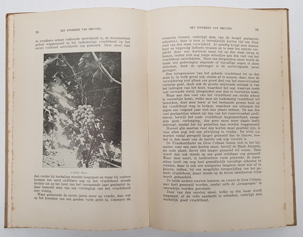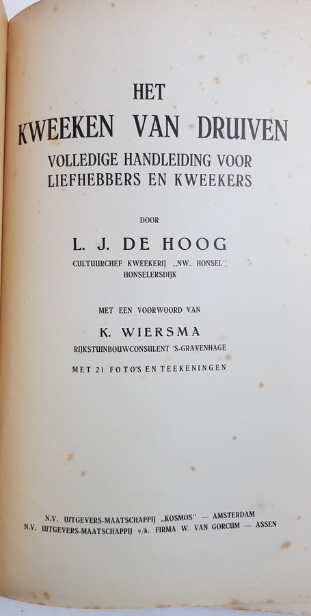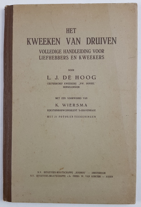 L. J. de Hoog - Het Kweeken van Druiven. Volledige handleiding voor liefhebbers en kweekers (...) met 21 foto's en teekeningen. Amsterdam: Kosmos, z.j. [ca. 1930]. Hardcover, halflinnen. 91pp. 8vo (23x16 cm). |