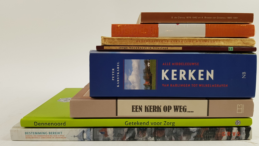Een lot boeken met betrekking tot kunst en architectuur, voornamelijk met betrekking tot de noordelijke provincies. Onder meer: Peter Karstkarel: Alle Middeleeuwse kerken van Harlingen tot Wilhelmshaven (hardcover). [Totaal: 8]. |