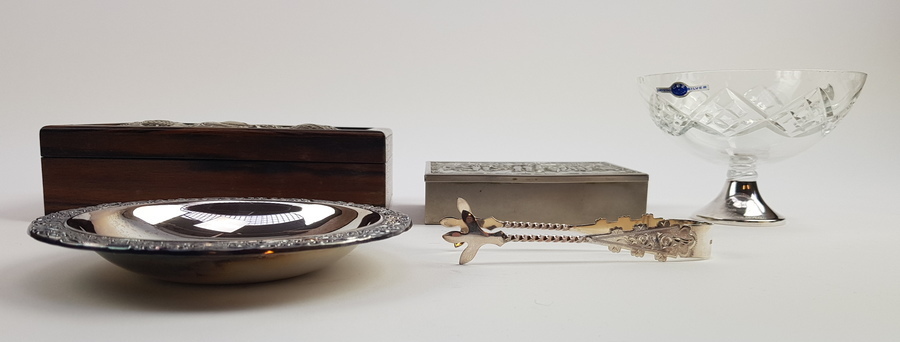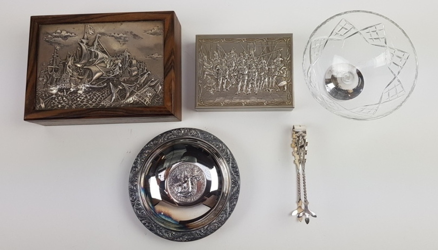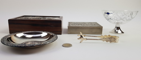 Zilver/onedel, lot diversen. 20e eeuw. Waaronder: asbak+ metalen doosje, beiden onedel. De rest is zilver. |