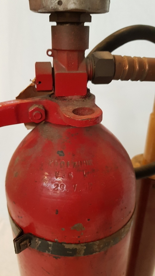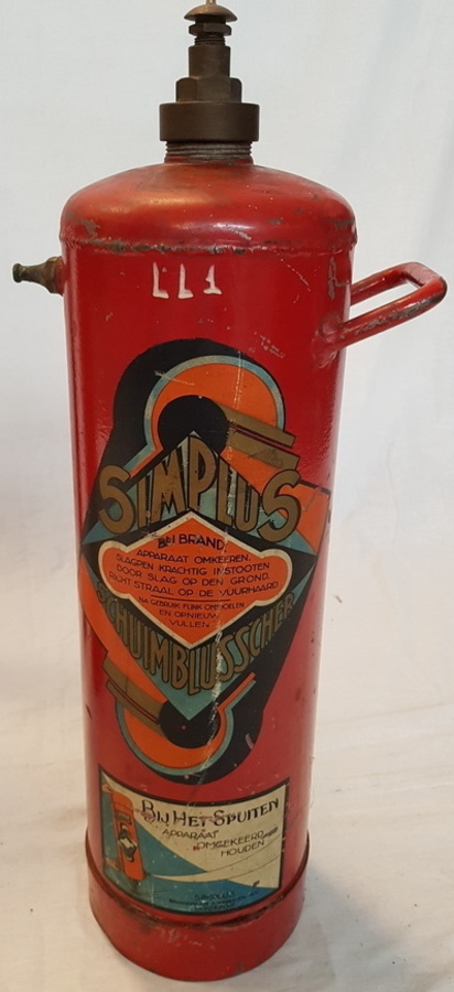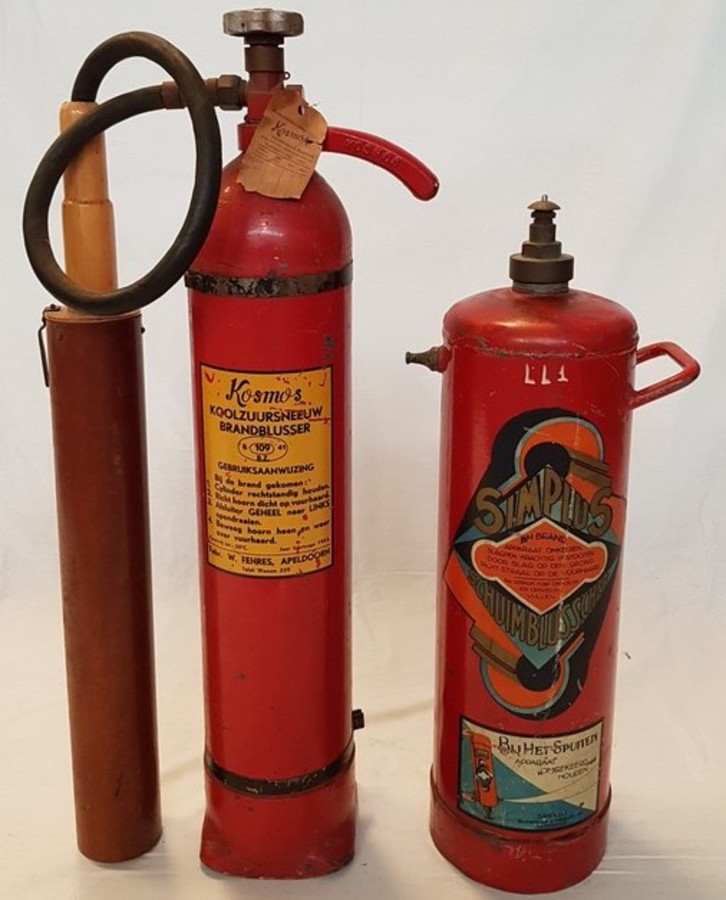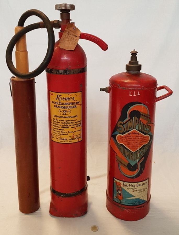 Metalen brandblussers, Cosmos en Simplus, 20e eeuw. Niet voor blusdoeleinden maar alleen decoratief |