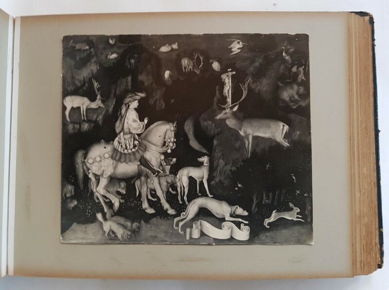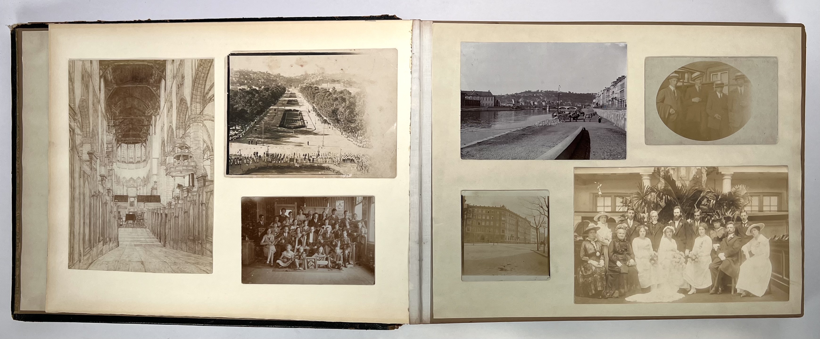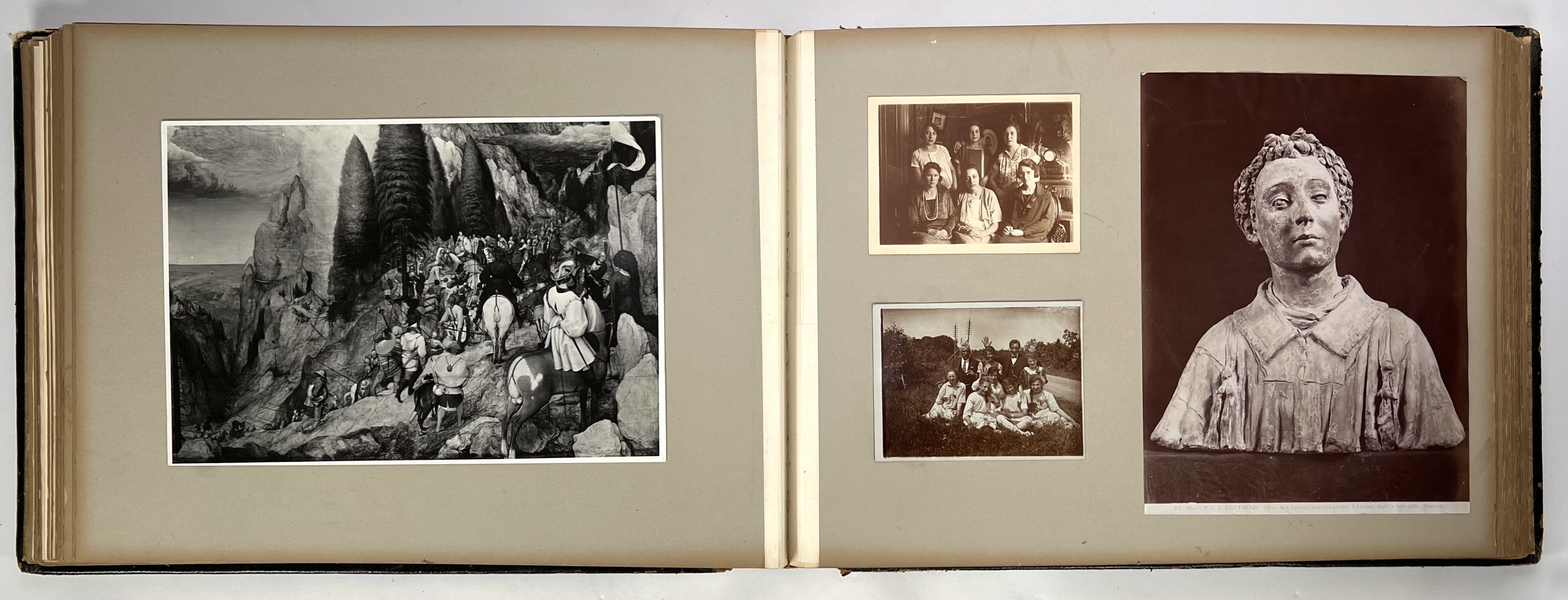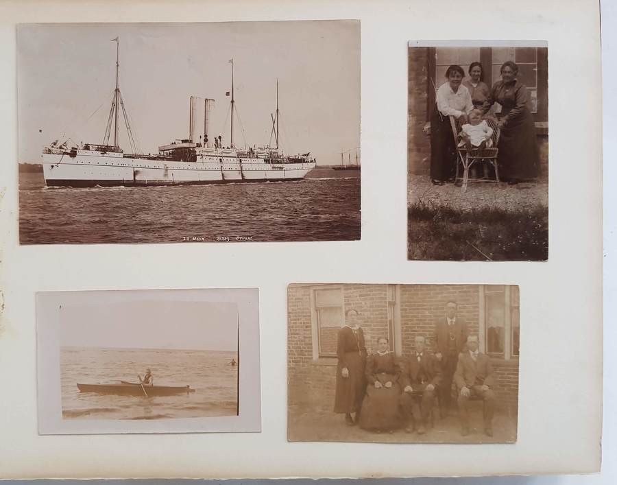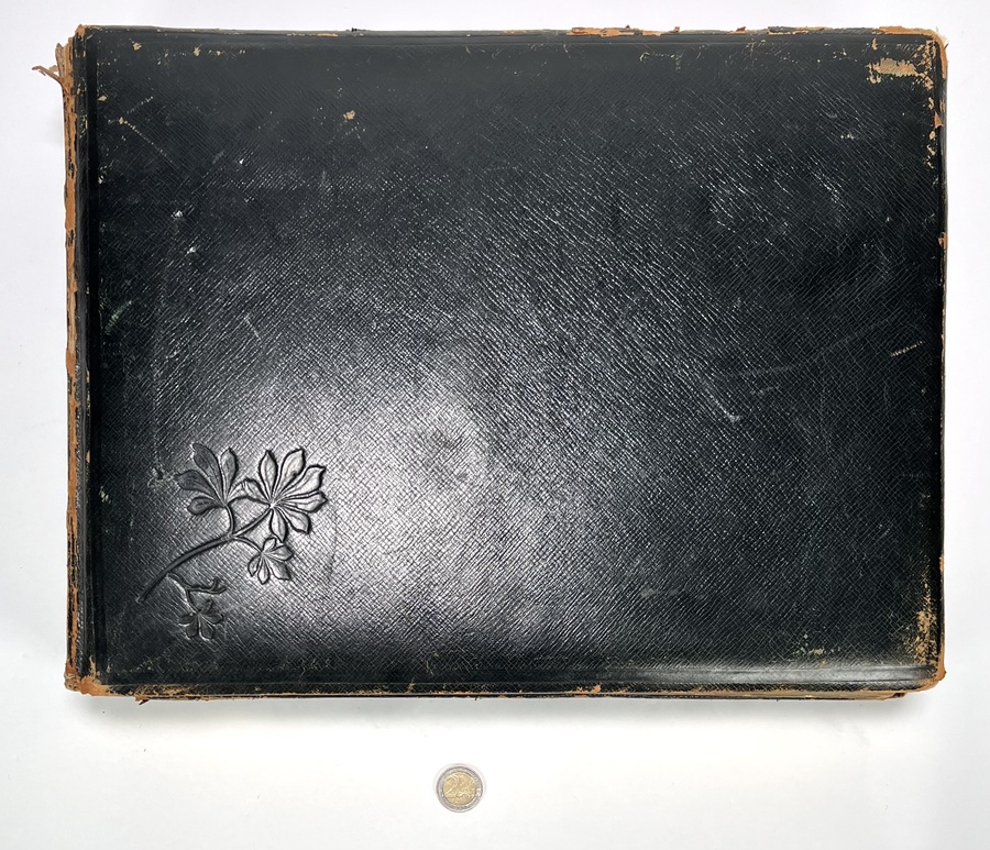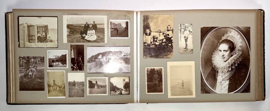 Oblongformaat zwart album, gevuld met veelal albumine foto's van topografische onderwerpen, familie en foto's van kunst uit de periode 1870-1910. Topografisch onder andere Amsterdam. Scheveningen, Parijs en meer. Circa 200 fotografische afbeeldingen. |