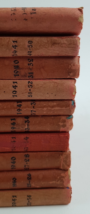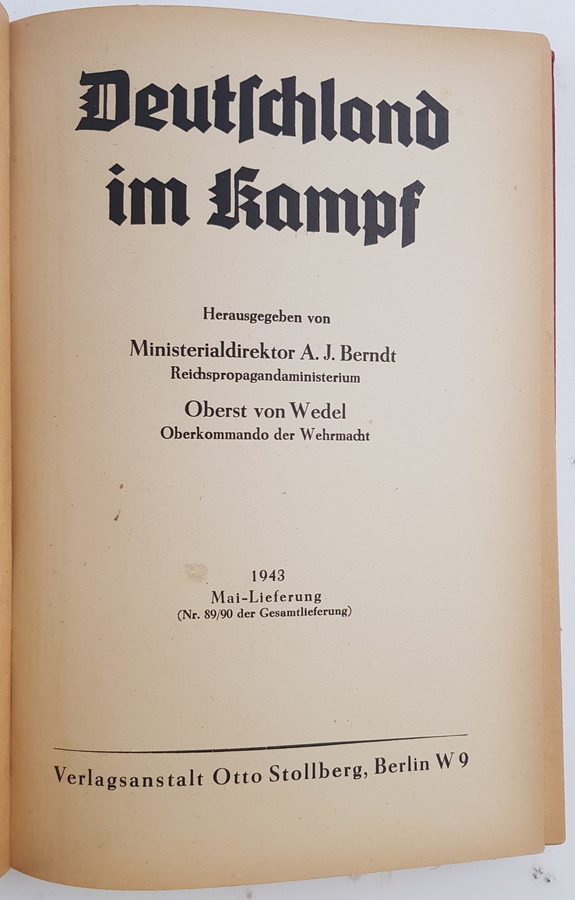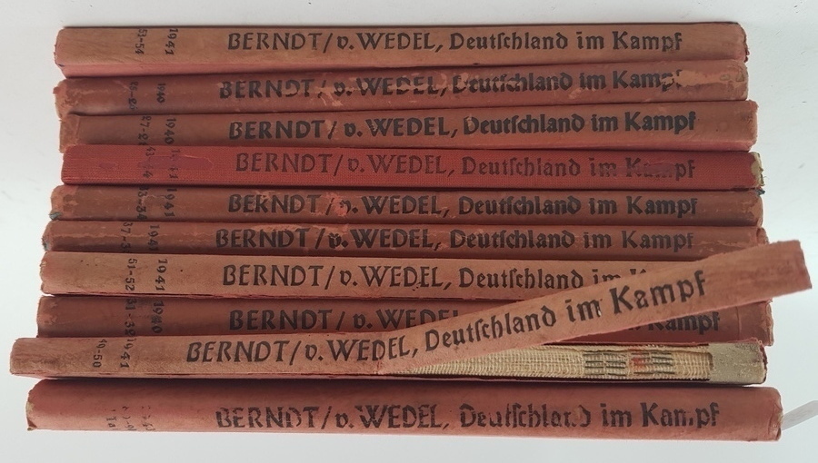 A. J. Berndt e.a. - Deutschland im Kampf. Berlin: Verlagsanstalt Otto Stollberg. 10 uitgaven van deze serie, tussen aflevering 25 en 26 (1940) en aflevering 89 en 90 (1943). Incomplete serie. Uniform gebonden met rood gekartonneerde platten. Ca. 150pp. per aflevering. |