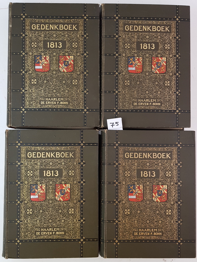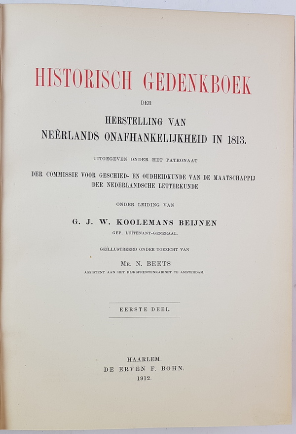 G. J. W. Koolemans Beijnen - Historisch Gedenkboek der Herstelling van Neerlands Onafhankelijkheid in 1813. 4 delen (register manco). Haarlem: de Erven F. Bohn, 1912/1913. Uniform gebonden in linnen. Met uitvouwbare platen en vele afbeeldingen in zwart/wit. Ca. 500-600pp. per deel. 8vo (24,5x18 cm). |
