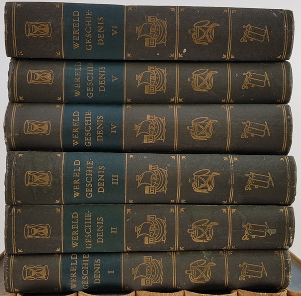 | Conditie | Zeer redelijk. Titel op de ruggen vervaagd. Naam voorin de delen. De 6 delen wereldgeschiedenis zeer redelijk tot goed. | |