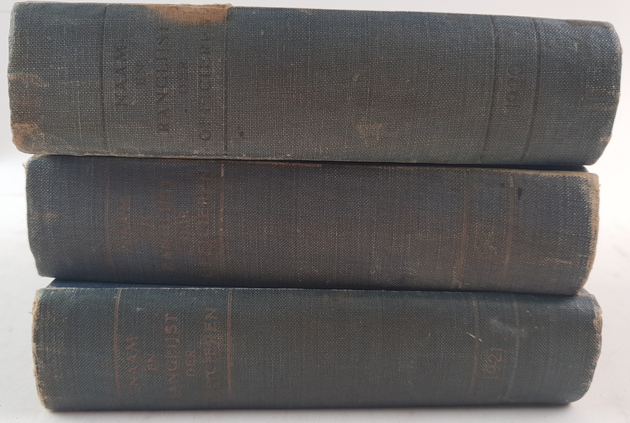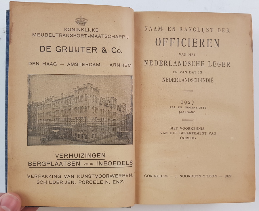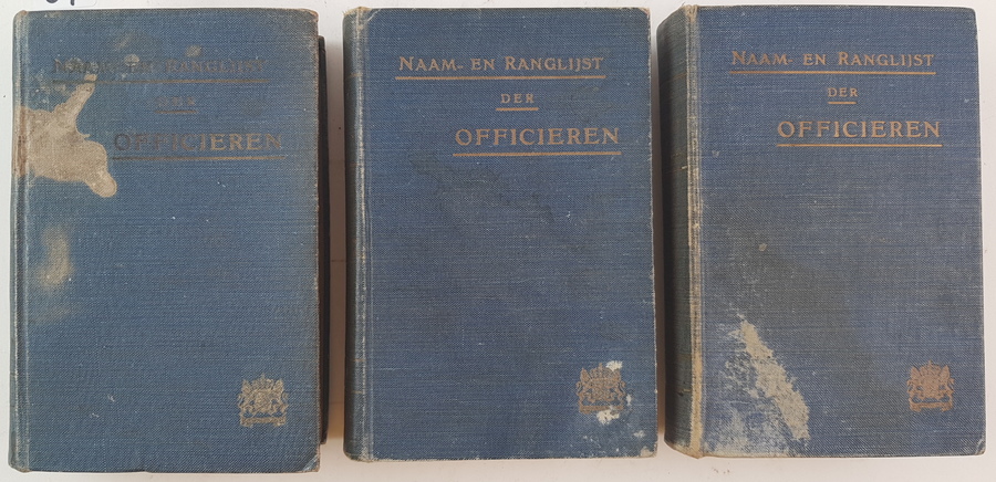 Naam- en Ranglijst der Officieren van het Nederlandsche Leger en van dat in Nederlandsch-Indie (...). 3 Jaargangen: 1920, 1921 en 1927. Gorinchem: J. Noorduyn en Zoon, 1920/1927. Uniform gebonden in blauw linnen. Ca 750pp. per jaargang. |