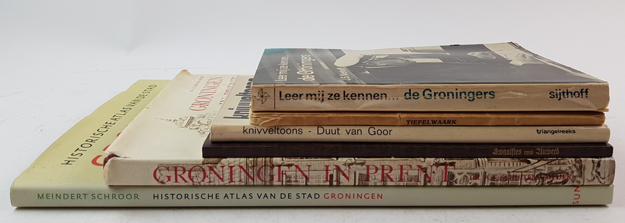 Meindert Schroor - Historische Atlas van de stad Groningen. Van esdorp tot moderne kennisstad. Amsterdam: SUN, 2009. Hardcover, linnen, met stofomslag. Met vele fraaie afbeeldingen in kleur. 80pp. 4to (34x25 cm). + 5 andere titels over de stad en provincie Groningen. |