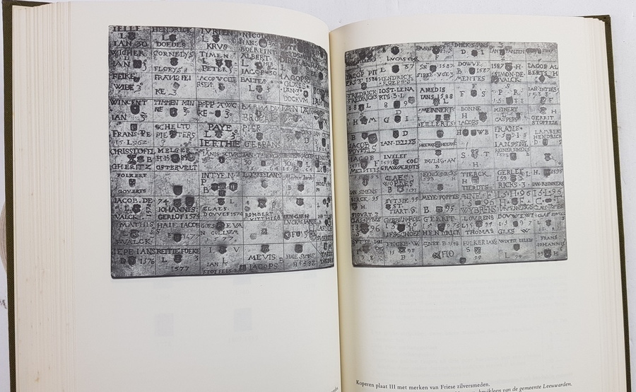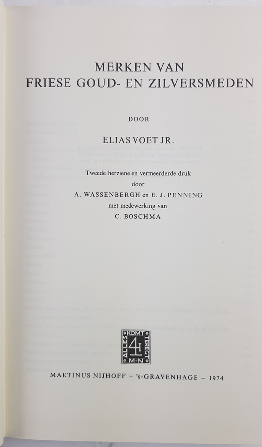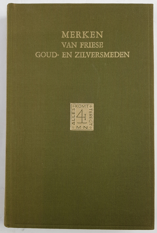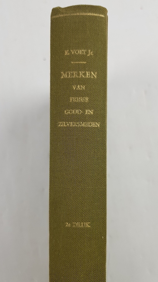 Elias Voet Jr. - Merken van Friese Goud- en Zilversmeden. 's-Gravenhage: Martinus Nijhoff, 1974. Tweede herziene en vermeerderde druk. Hardcover, gebonden in linnen met goudopdruk op voorplat en rug. 371pp. 4vo (25x16,5 cm). Belangrijk naslagwerk over Friese goud- en zilvermerken. |