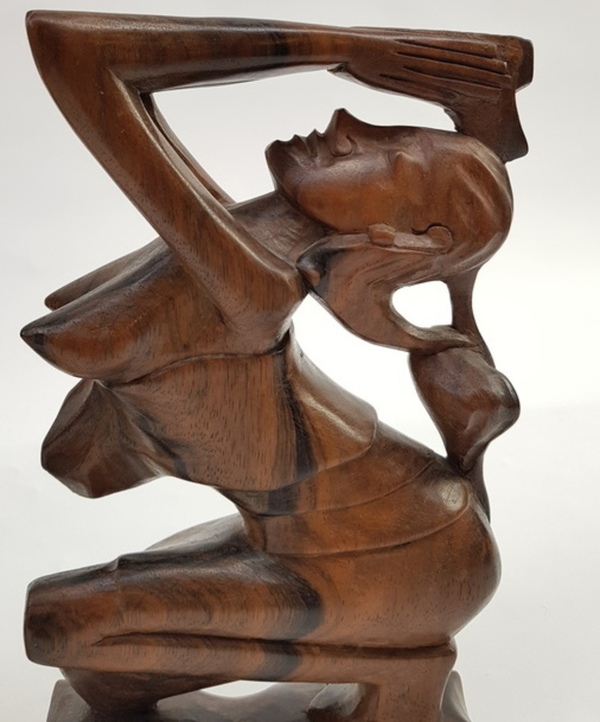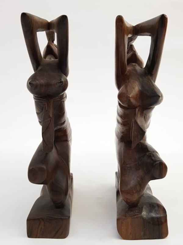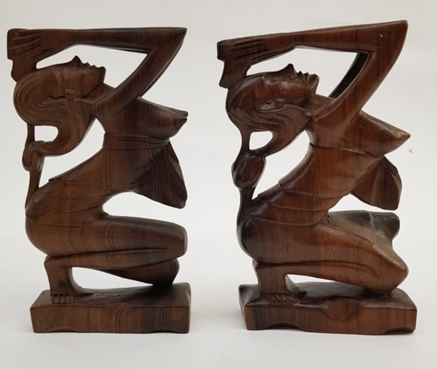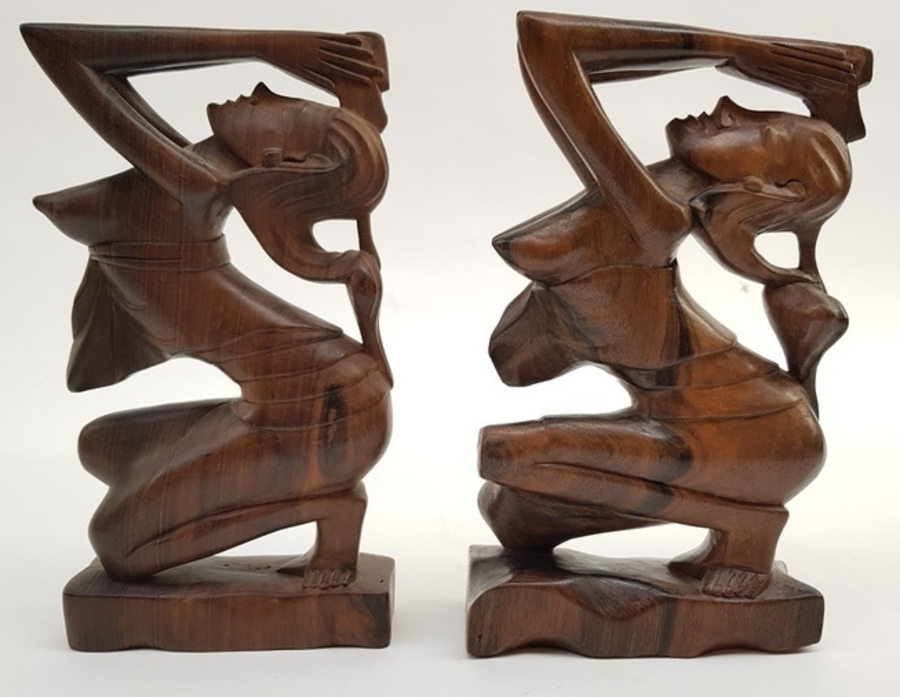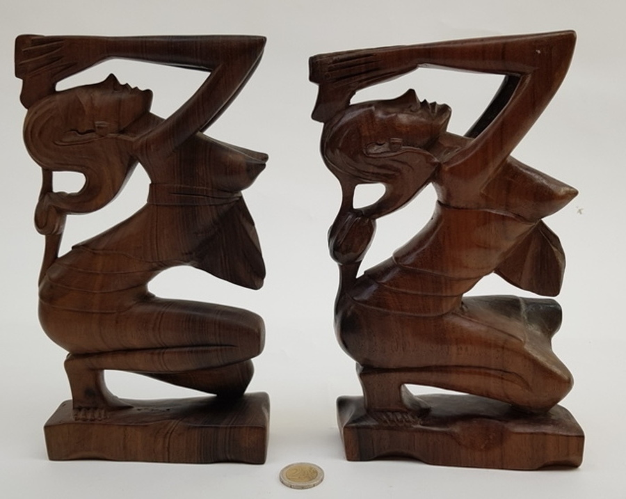 Een paar pallissander sculpturen in de vorm van biddende vrouwen. Indonesië, midden 20e eeuw