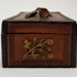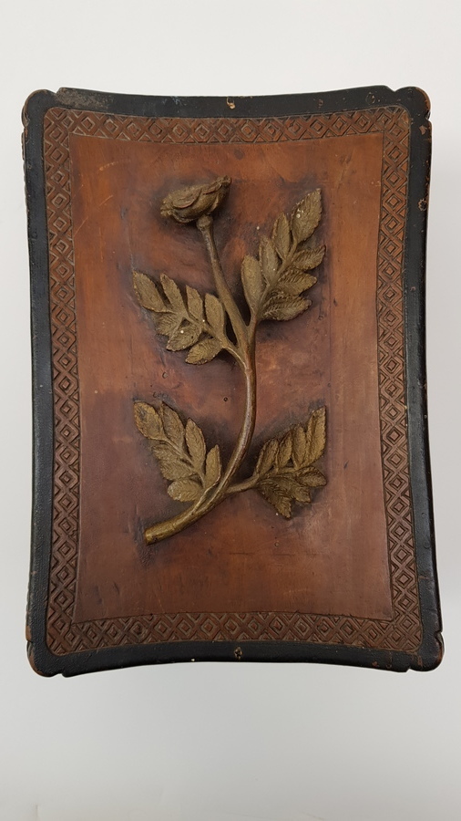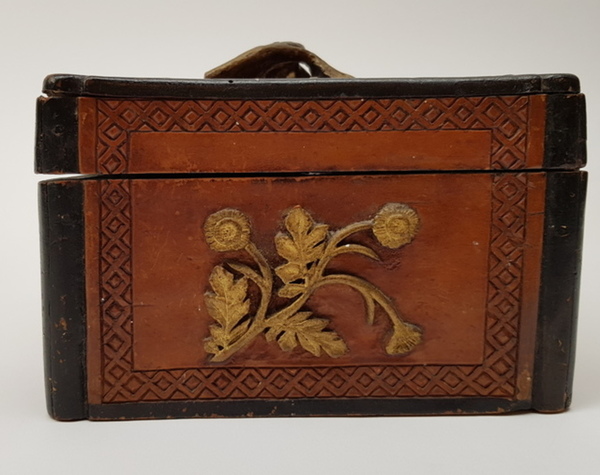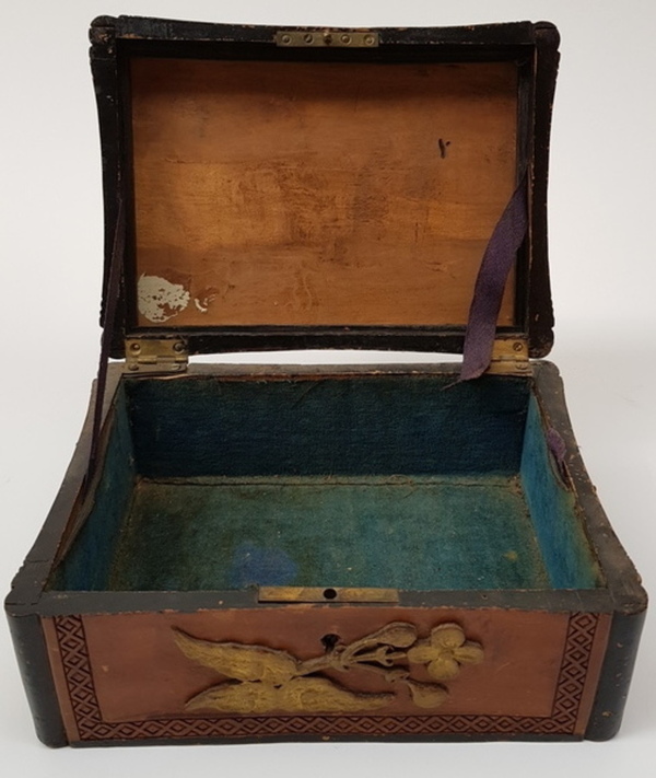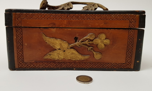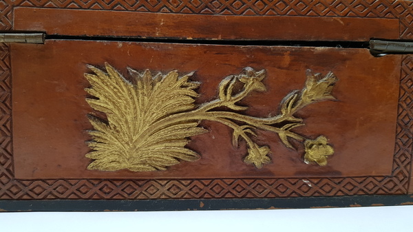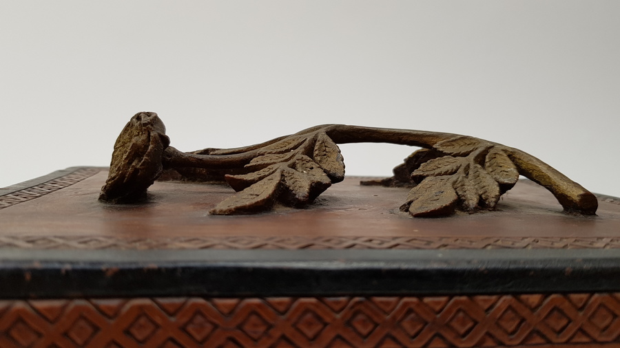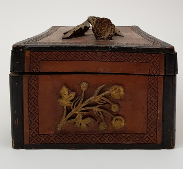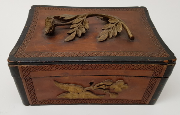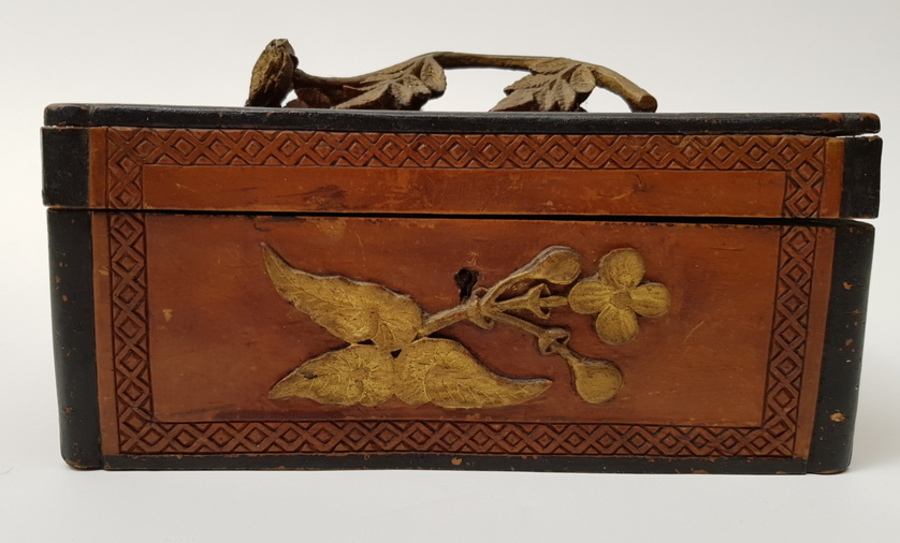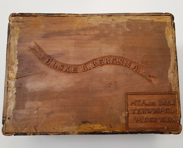 Hout, bewerkte antieke kist. Friesland 1898. Inscriptie aan de onderzijde: M.T.A. Boer Terwispel 14 december 1898 en Elske B.Bergsma. Deksel met bloem van hout. |