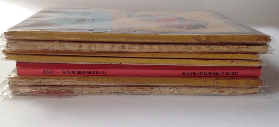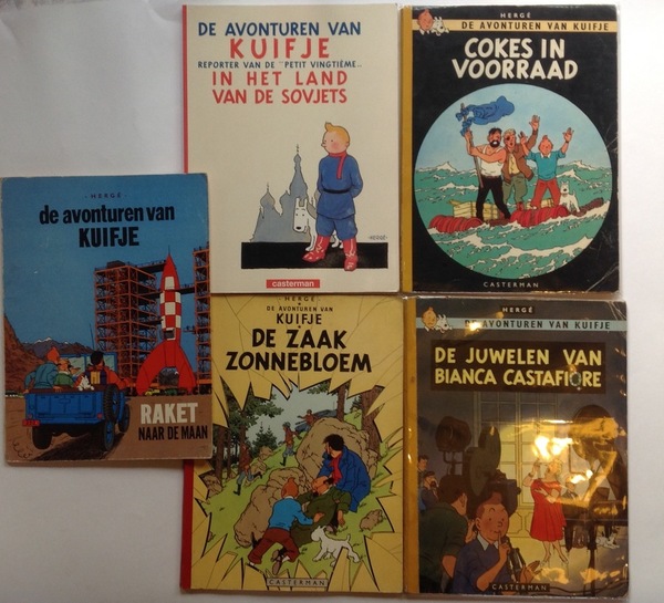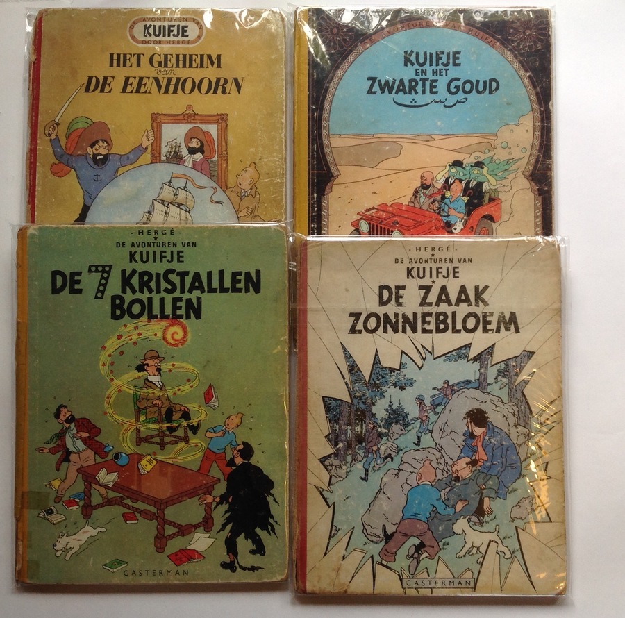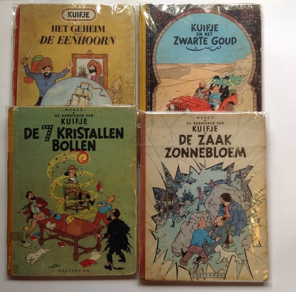 Kuifje en het zwarte goud, 2e druk 1955. De 7 kristalbollen, herdruk 1956. Het geheim van de eenhoorn, herdruk 1952. Kuifje De zaak Zonnebloem, 1e druk 1956.