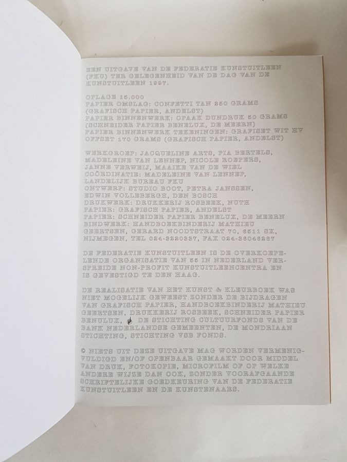 Met werk van o.a. Marlene Dumas, Klaas Gubbels en Co Westerik Madeleine van Lennep e.a. - Kunst en kleurboek - FKU (Federatie Kunstuitleen), ter gelegenheid van de dag van de kunstuitleen, 1997 - 52 pag. - paperback - afmeting: 32 x 23 cm - oplage: 15.000 |