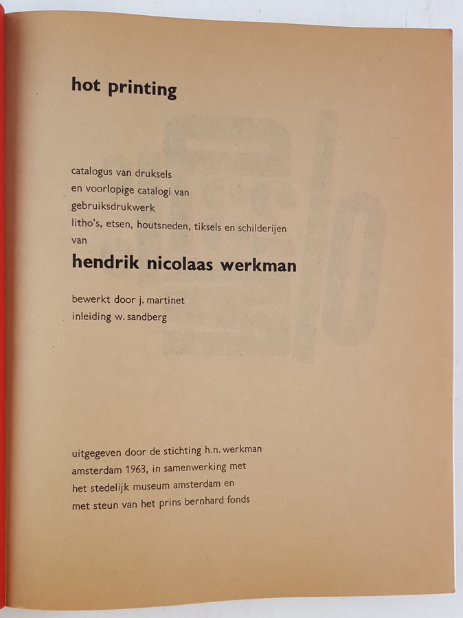 W. Sandberg (inl.); J. Martinet (bew.) - Hot Printing (1963). catalogus van druksels en voorlopige catalogi van gebruiksdrukwerk. Litho's, etsen, houtsneden, tiksels en schilderijen van Hendrik Nicolaas Werkman. Amsterdam, Stichting H. N. Werkman, 1963. Paperback, met vele fraaie afbeeldingen in kleur en zwart/wit. 218pp. |