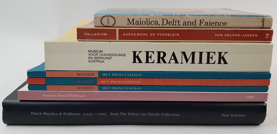 Een divers lot boeken over aardewerk en porselein, waaronder de titel Dutch Majolica & Delftware (1550-1700) from the Edwin van Drecht Collection, door Frits Scholten [Totaal: 8]. |