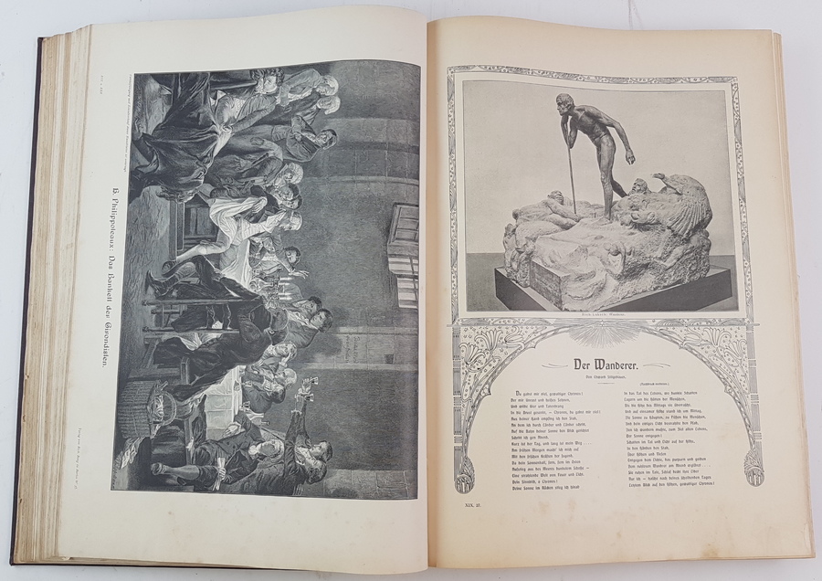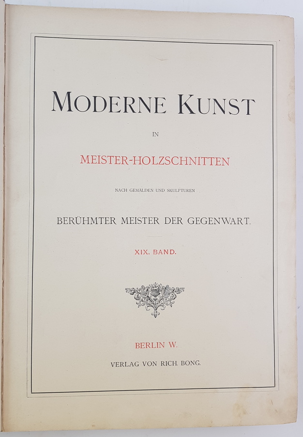 N/A - Moderne Kunst in Meister-Holzschnitten nach Gemalden und Skulpturen (...) XIX. Band. Berlin: Rich. Bong, z.j. (ca. 1900). 1 deel uit een grotere serie. Gebonden in linnen. Gestempelde platten en rug, goudopdruk. Folio (42x32 cm). Met vele fraaie ongepagineerde staalgravures, daarnaast 336pp. |