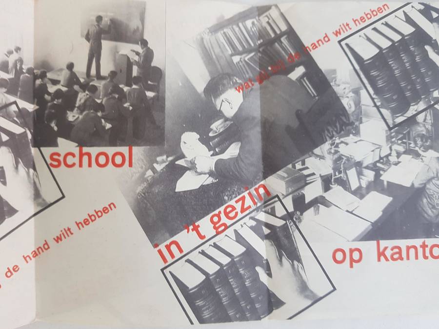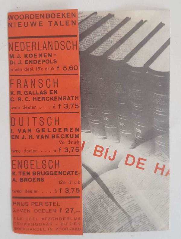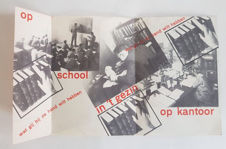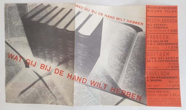 Wolters Noordhoff woordenboeken. Dubbelgevouwen folder met aan de binnenzijde een fotomontage van Paul Schuitema. Wat gij bij de hand wil hebben op school, in 't gezin, op kantoor. Afm opgevouwen 11,5x16 cm. |
