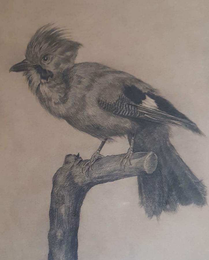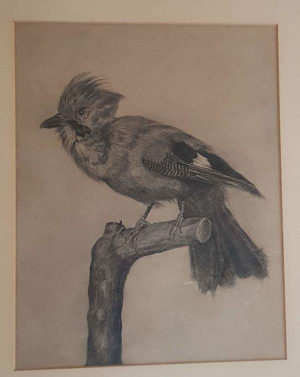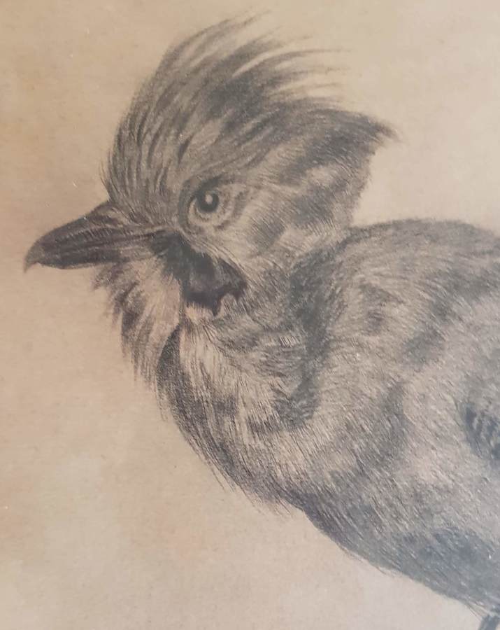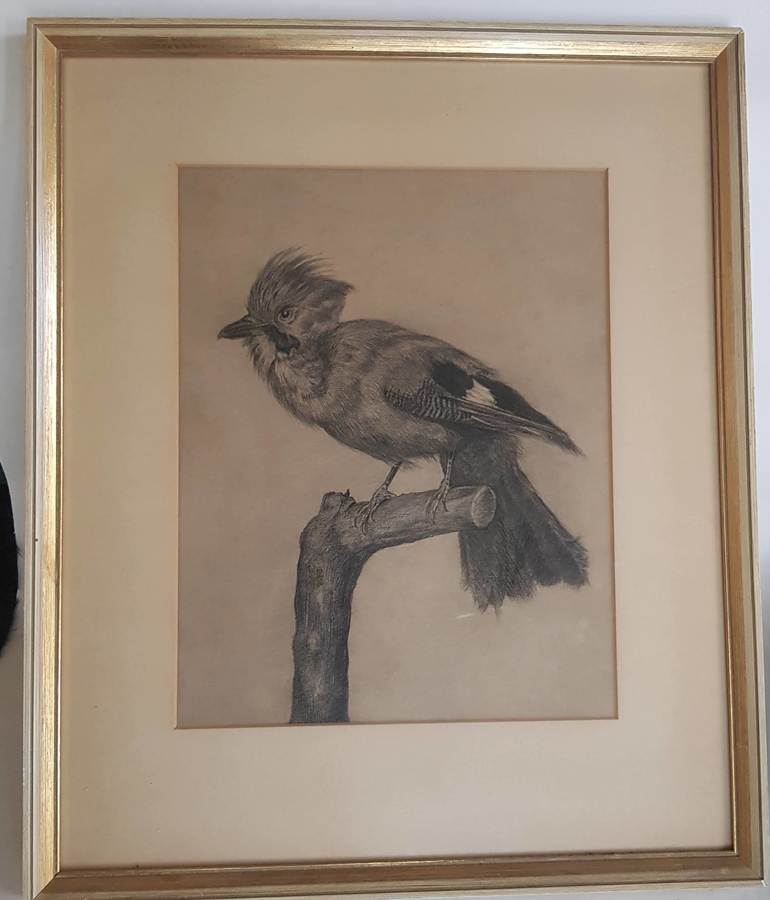 Fraaie kwaliteiet potlood tekening van een paradijsvogel. Inglijst achter passe-partout. Afm 35x27 cm. |