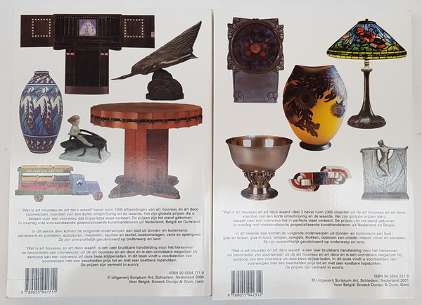 Rob Zeegers e.a. (red.) Wat is art nouveau en art deco waard. 2 delen compleet. Schiedam: Scriptum Art, Gent: Snoeck-Ducaju & Zoon 2000/2001. Paperback. Vele afbeeldingen in kleur en zwart/wit. 302; 335pp. 8vo (24,5x17 cm). |
