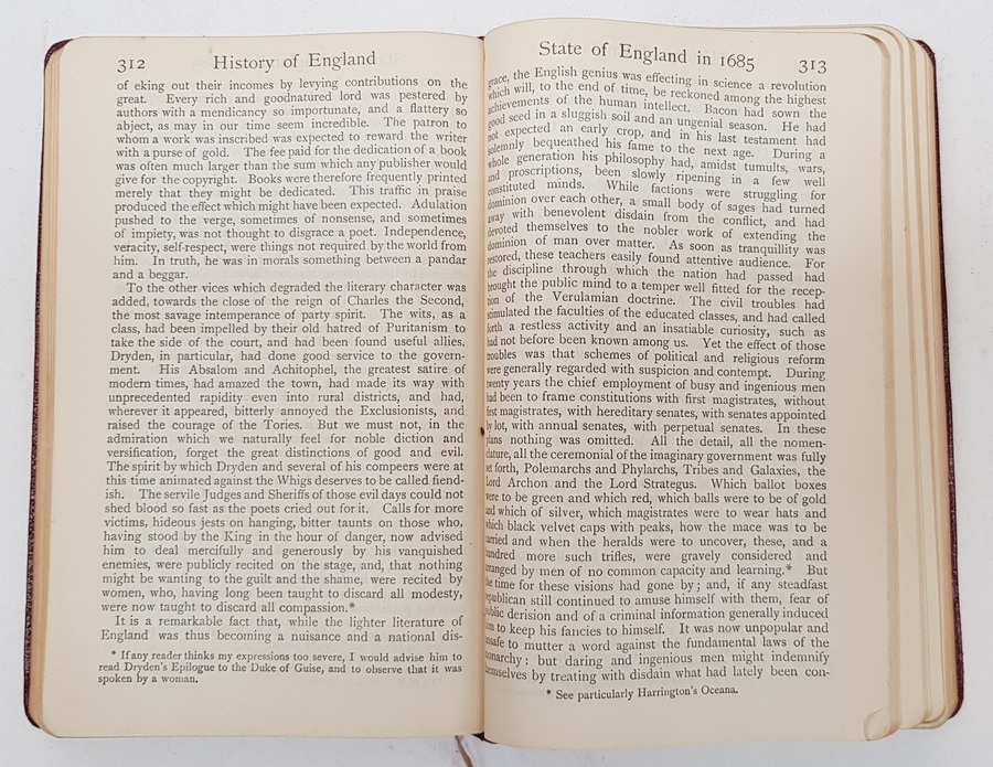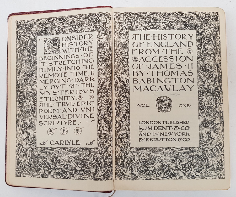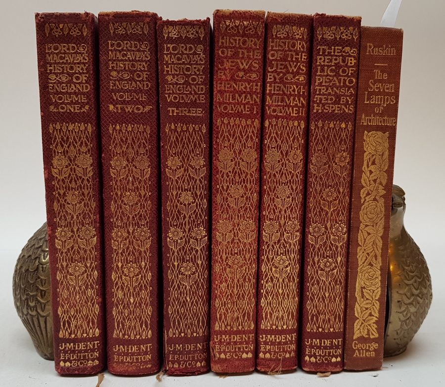 Thomas Babington Macaulay - The History of England from the Accession of James II. London: J. M. Dent & Co, z. j. [ca. 1910]. 3 delen, Uniform gebonden, slappe kaft. Hierbij: 3 andere uitgaven: Henry H. Milman - The History of the Jews (2 banden); The Republic of Plato (beide uitgave J. M. Dent) en Ruskin - The Seven Lamps of Architecture (uitgave George Allen, London). [Totaal: 7]. |