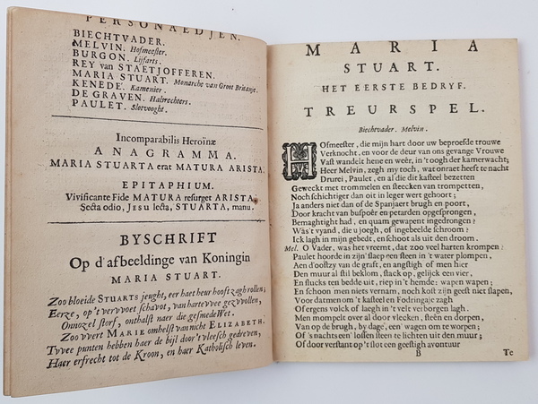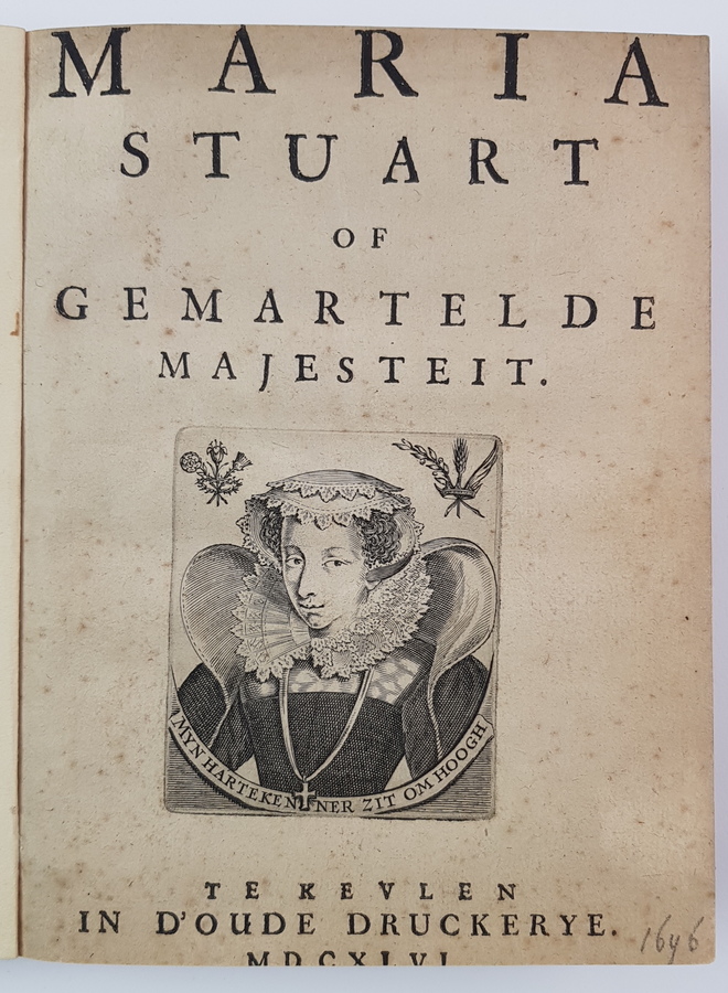 Joost van den Vondel - Maria Stuart of Gemartelde Majesteit. Keulen: In d' oude Druckerye, 1646. Herbonden in halflinnen, papier opnieuw afgesneden. Ongepagineerd. 8vo (18x14 cm). |