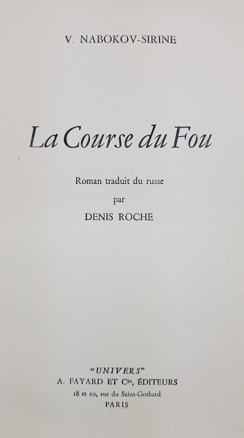 V. Nabokov Sirine (pseud. Vladimir Nabokov) - La Course du Fou. Paris: 'Univers', A. Fayard et Cie., 1934. Eerste druk van de Franse vertaling van dit werk van Nabokov. Softcover. 320pp. |
