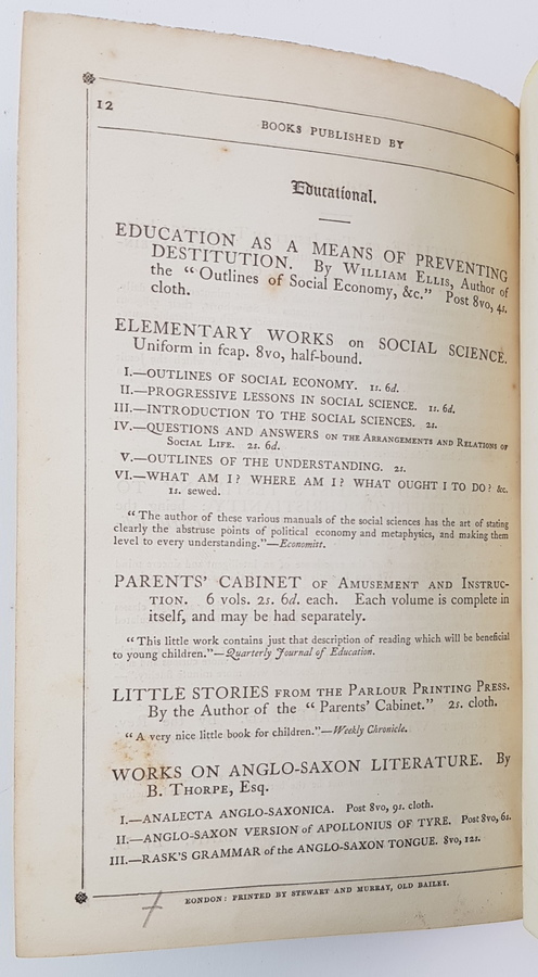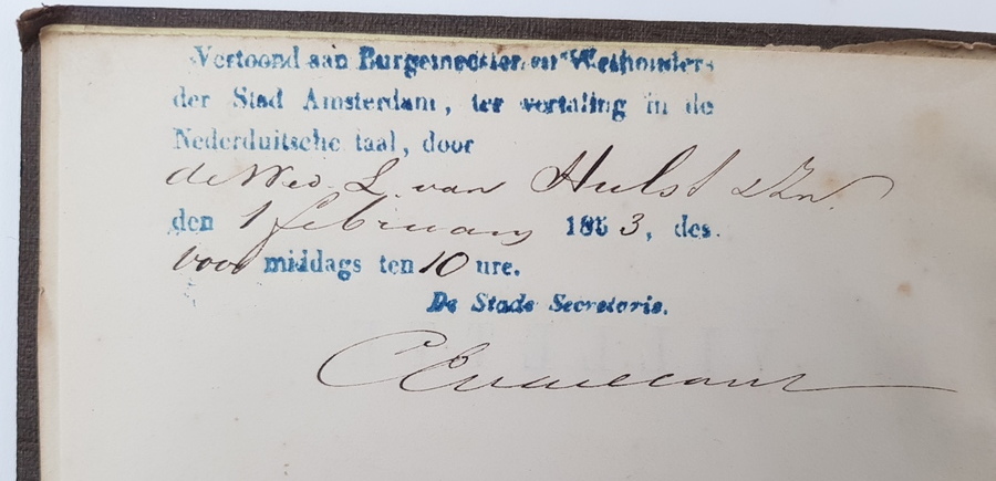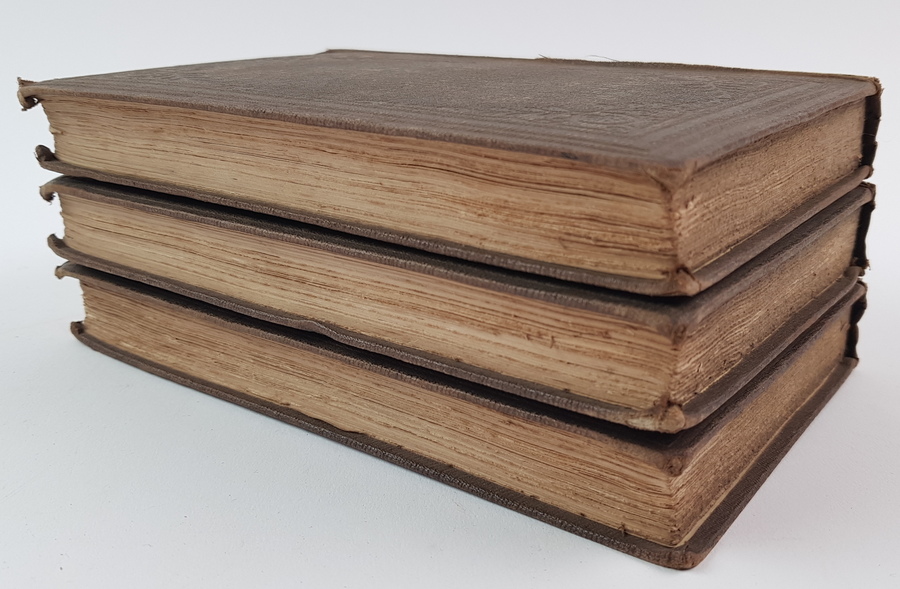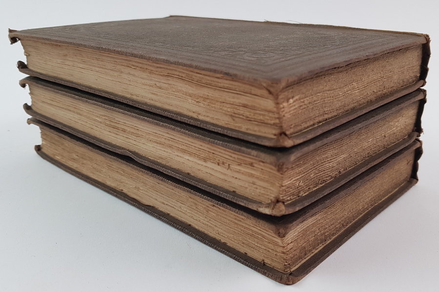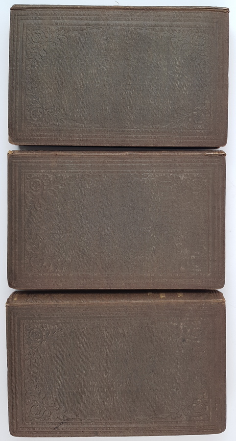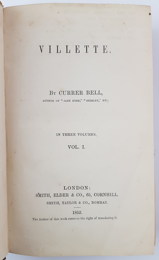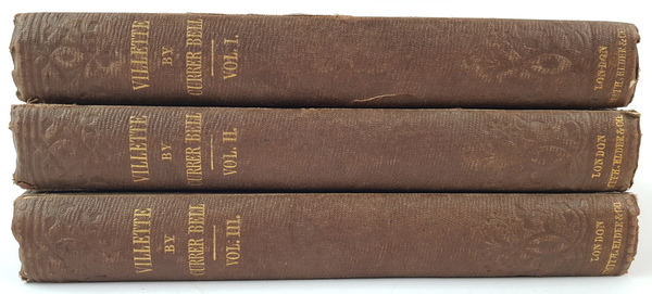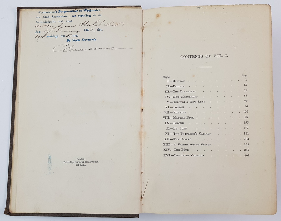 Currer Bell (pseud. Charlotte Brontë) - Villette. 3 delen, compleet. Eerste druk, Britse uitgave. London: Smith, Elder and Co., 1853. Uniform gebonden in linnen, gestempelde uitgeversband, goudopdruk op de rug. 324, (12); 319; 350pp. 8vo (ca. 20x13 cm). Inclusief de 12 pagina's advertenties achterin deel 1. Getuige een stempel naast de inhoudsopgave voorin deel 1 is dit exemplaar aangeboden aan de Burgemeester en Wethouders der Stad Amsterdam op 1 februari 1853 'ter vertaling in de Nederduitsche taal' door De Wed. L. van Hulst & Zn. [uitgevers te Amsterdam]. Handtekening van Stads Secretaris (sic) C. E. Vaillant onder het stempel. 'De Wed. L. van Hulst en Zoon' in inkt voorin deel 1. Overigens verscheen Villette uiteindelijk (hoogstwaarschijnlijk) pas in 1856 in Nederlandse vertaling, bij een andere uitgever: J. F. V. Behrns te Harlingen. |