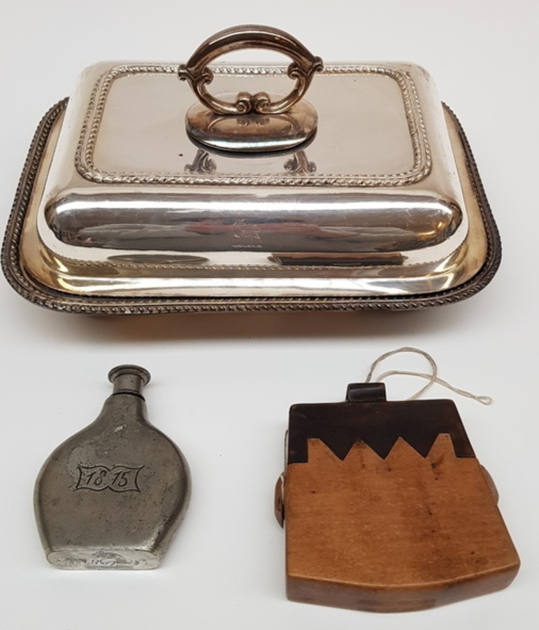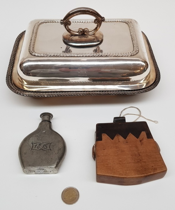 | Afmetingen | Dekschaal lengte 29 cm en hoogte 16 cm. Heupflacon hoogte 10 cm en breedte 7,5 cm en japans doosje lengte 11 cm en breedte 10 cm. |