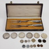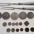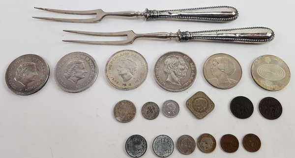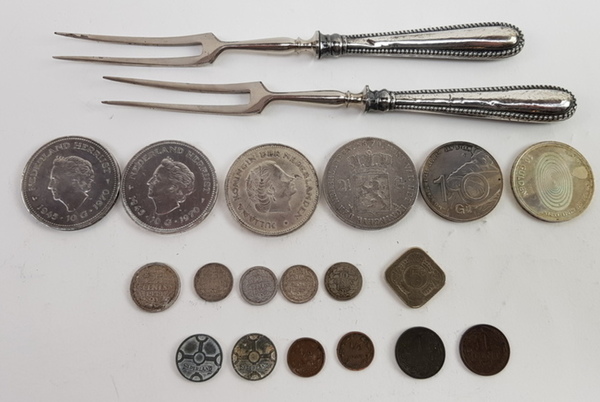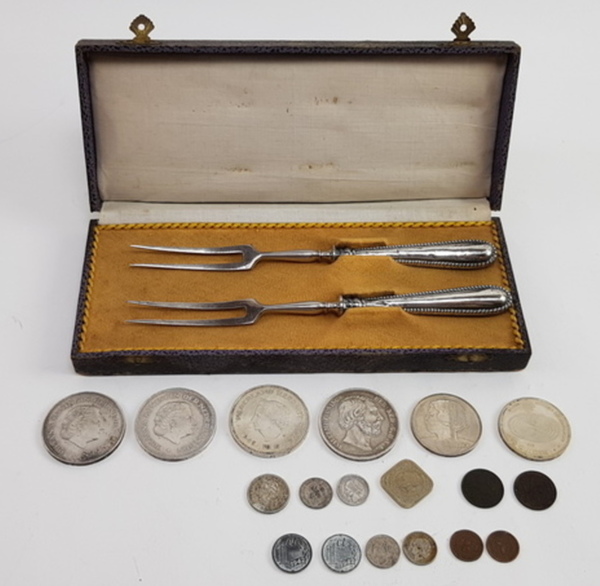 Zilver/onedel lot diverse munten + bestek 19/20e eeuw. Waaronder: 11 zilveren munten en 1 bestekdoos met 2 vleesvorken met zilveren heft ( in gebruikte conditie) |