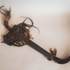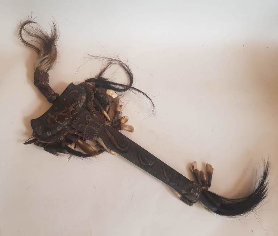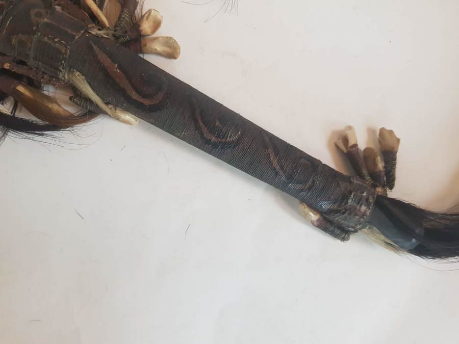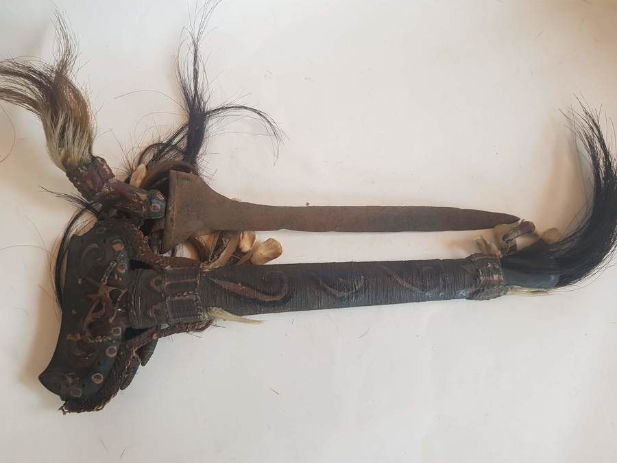Een Borneo dayak kris met beschilderde decoratie en gedecoreerd met tanden. L 48 cm. |