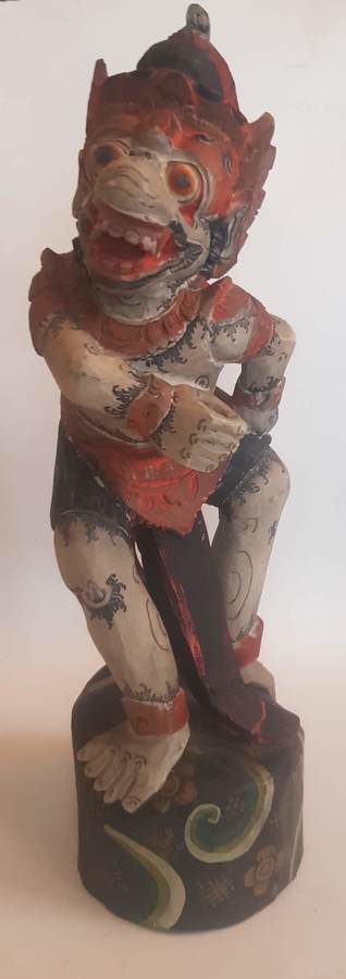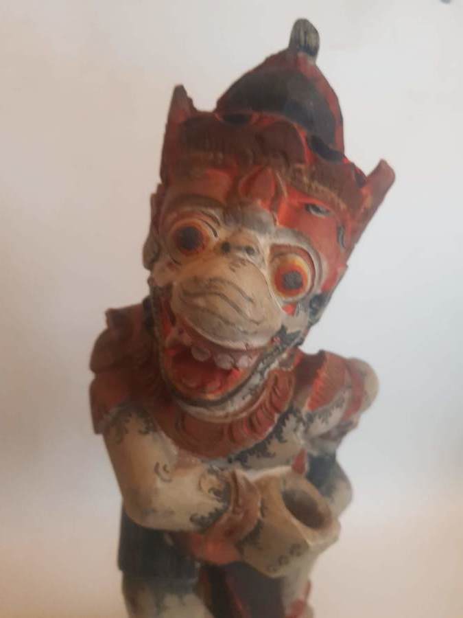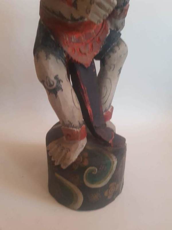 Staande Hannuman met polychrome decoratie. H 44 cm. |