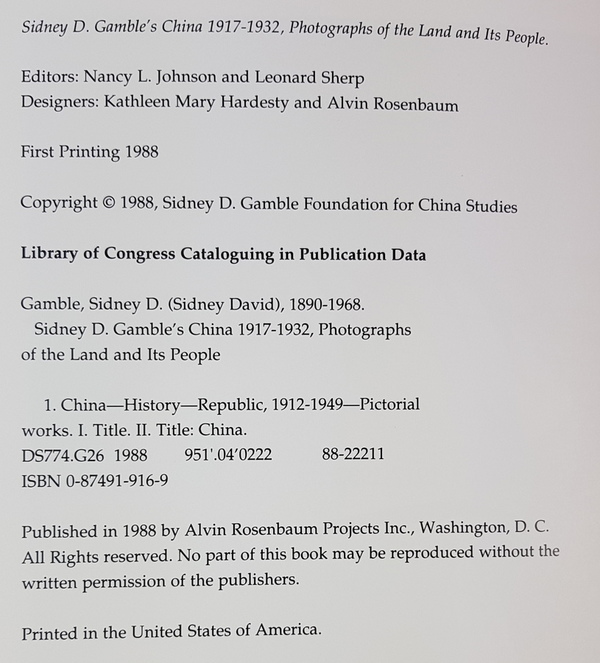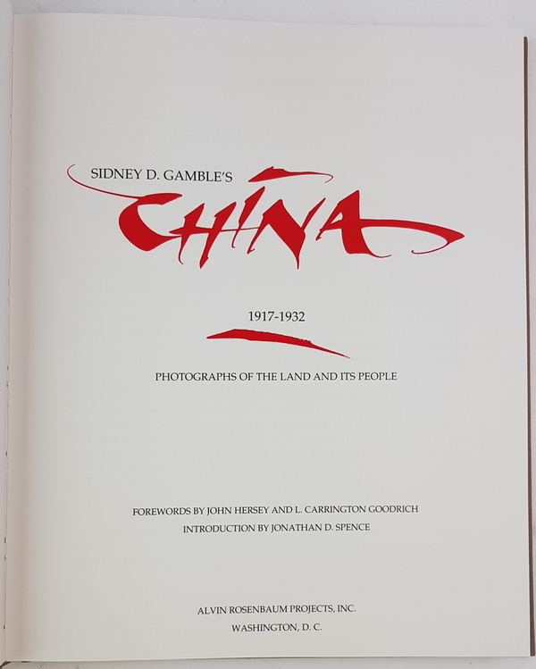 John Hersey e.a. (introductie) - Sidney D. Gamble's China 1917-1932. Photographs of the Land and its People. Washington DC: Alvin Rosenbaum Projects, 1988. Gebonden in een bruin linnen band, in de originele linnen map. De kartonnen doos bij de uitgave is ook nog aanwezig. Met vele foto's in zwart-wit van China in het begin van de 20e eeuw. 4to (32x27 cm). 191pp. |