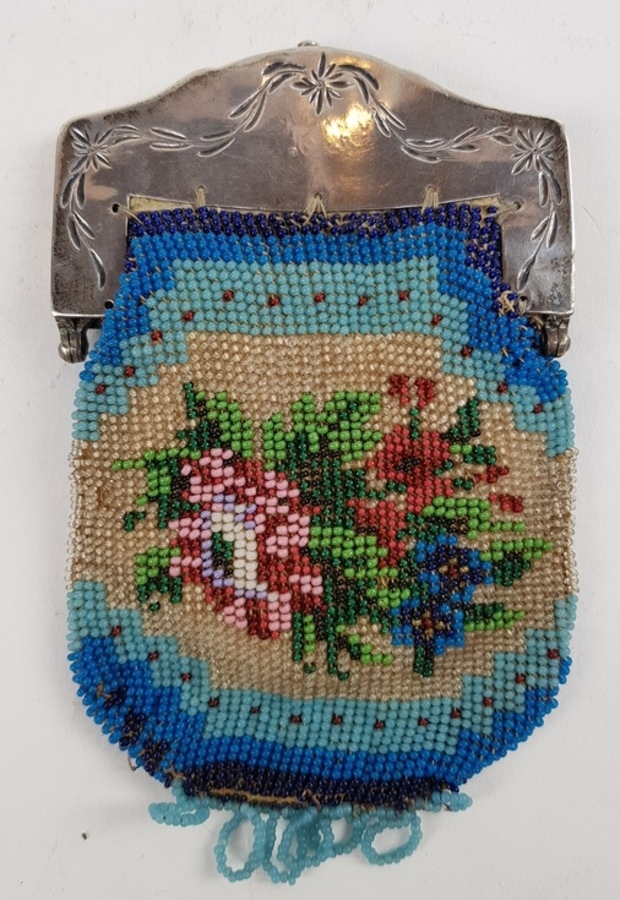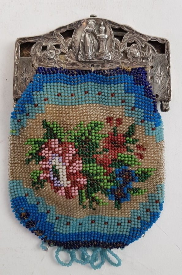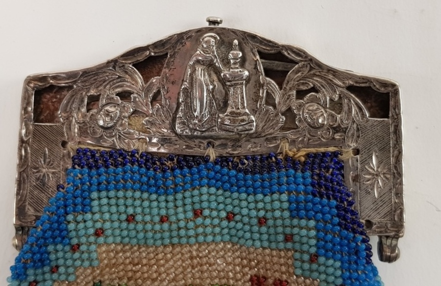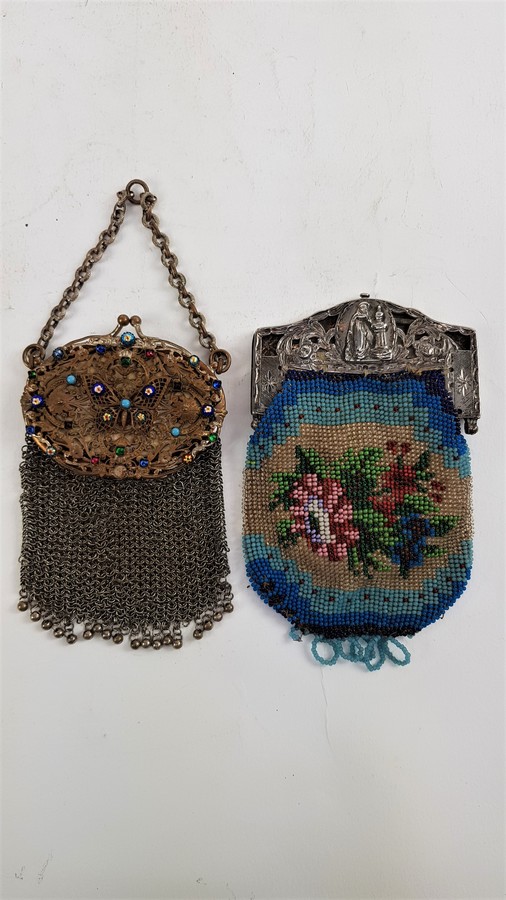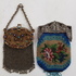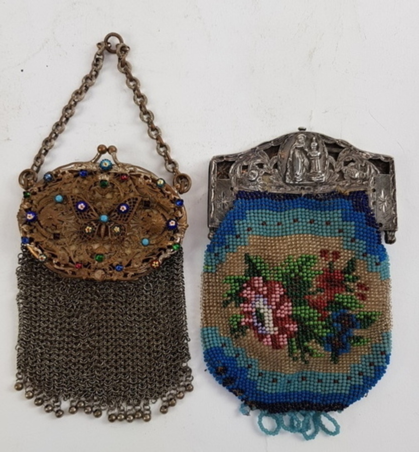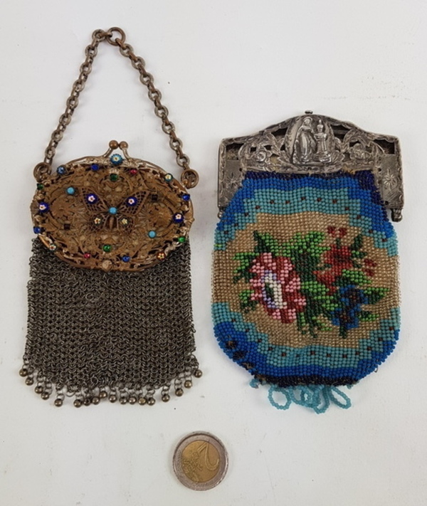 Zilver/ onedel, 2 kleine beursen 19/20e eeuw. 1 x kleine portemonnee onedel met erin een kleine spiegel. 1 x antieke kralenbeurs met zilveren beugel, 1818. |