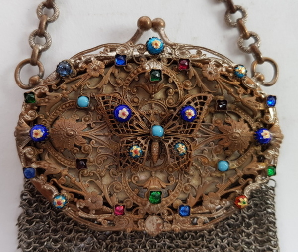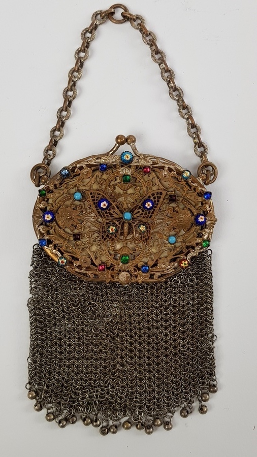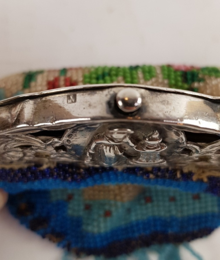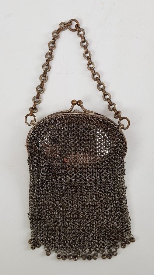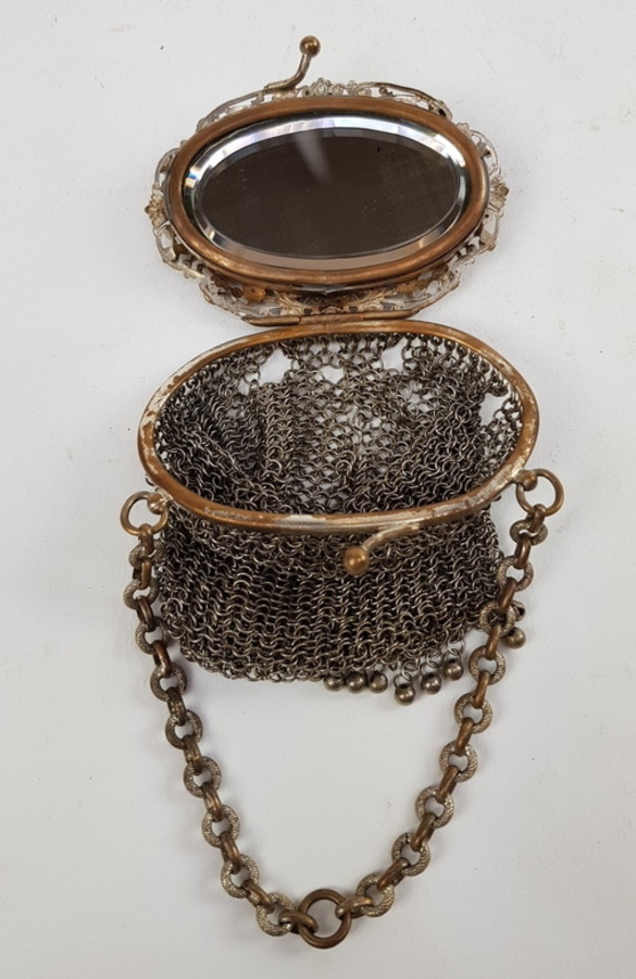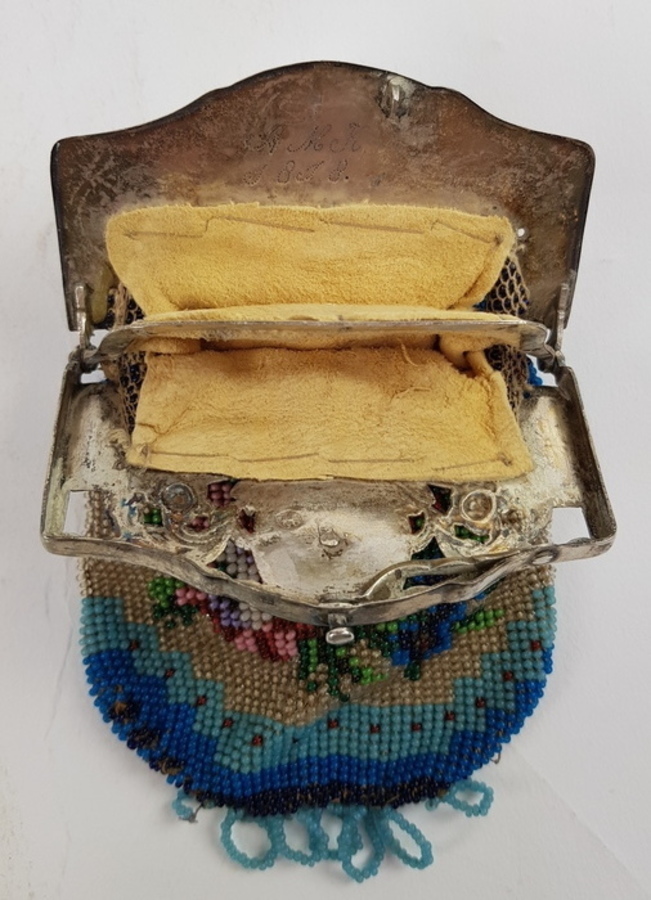 Zilver/ onedel, 2 kleine beursen 19/20e eeuw. 1 x kleine portemonnee onedel met erin een kleine spiegel. 1 x antieke kralenbeurs met zilveren beugel, 1818. |
