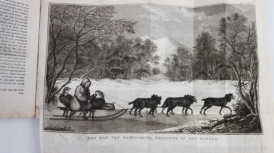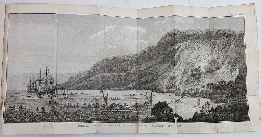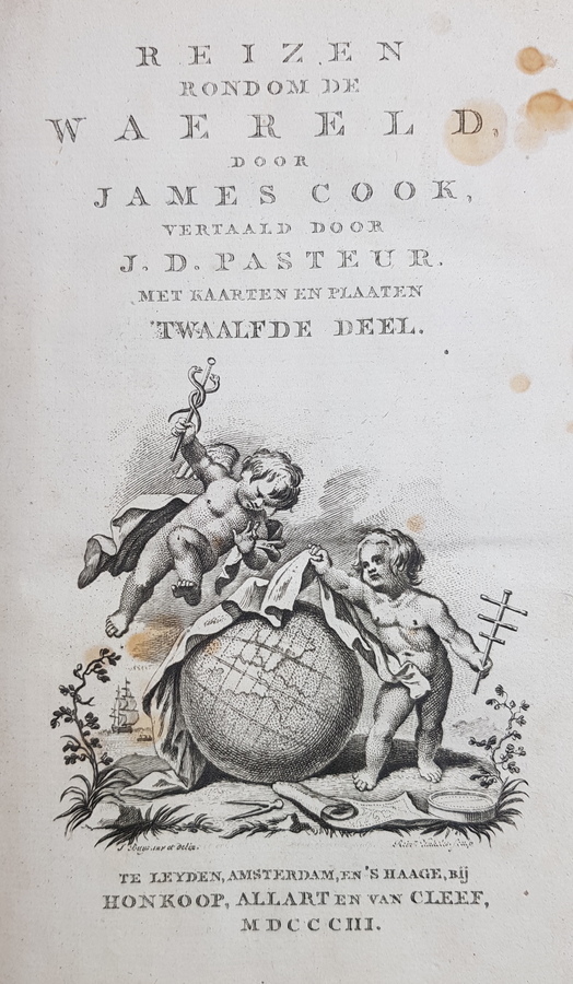 James Cook, J. D. Pasteur (vert.) Reizen rondom de Waereld. Twaalfde deel. Met Kaarten en Plaaten. Leiden, Amsterdam, 's-Gravenhage: Honkoop, Allart en van Cleef, 1803. Gekartonneerde, blinde band. Titel oudtijds op de rug geschreven. 1 deel uit de grotere, bekende serie. Met fraaie, veelal uitvouwbare platen en kaarten. 419pp. 8vo (21x13 cm). |