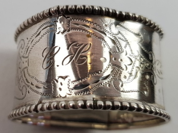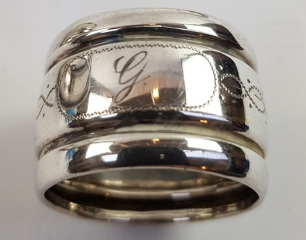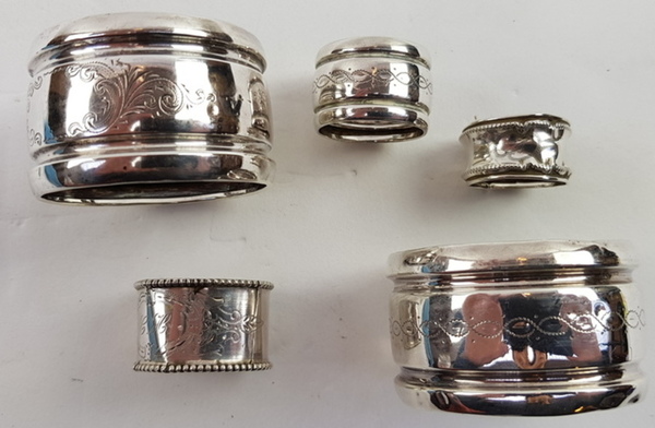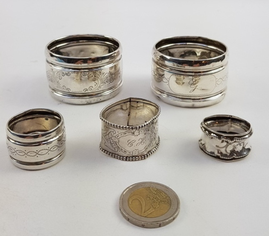Zilver, 2 servetringen + 3 vingerdoek ringen 19/ 20e eeuw. |