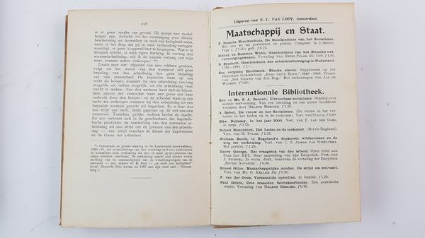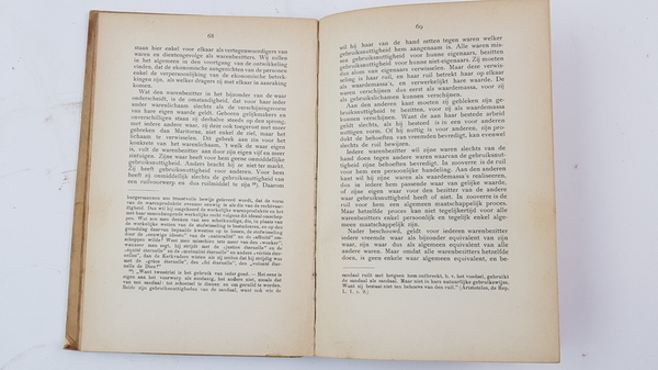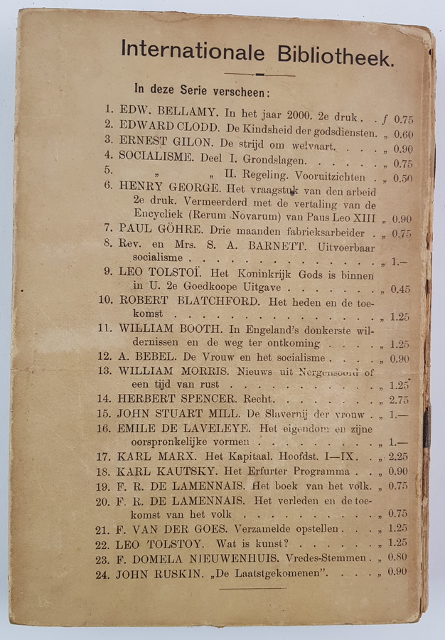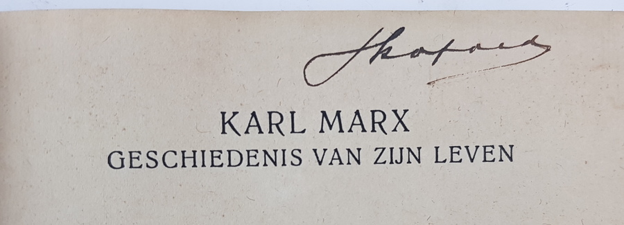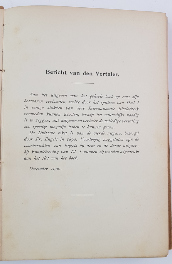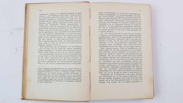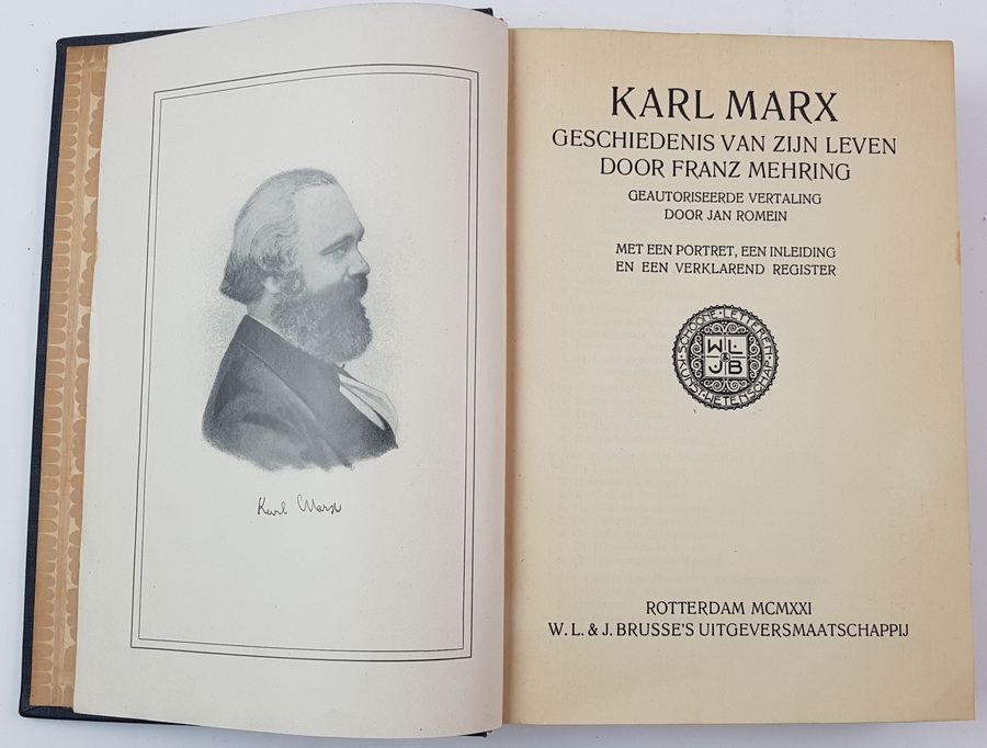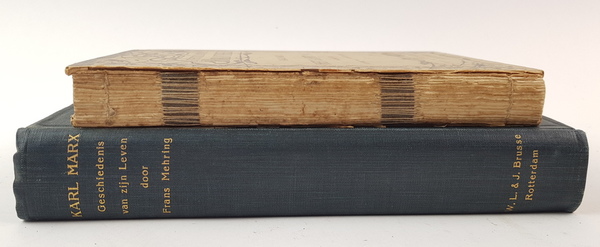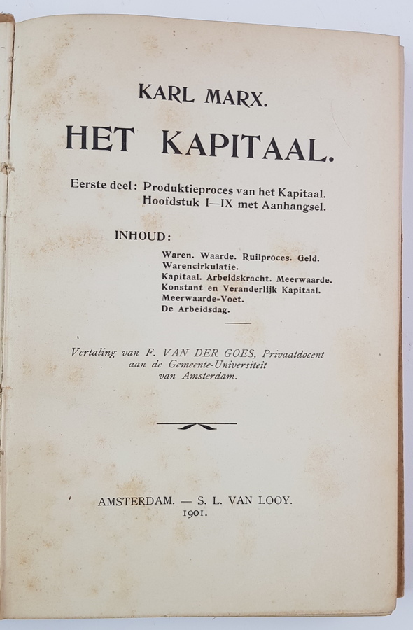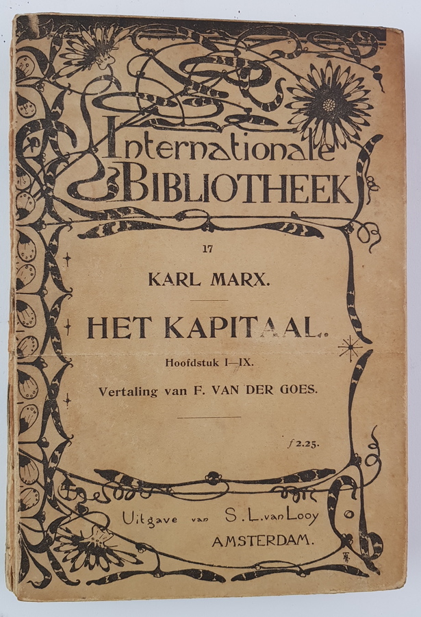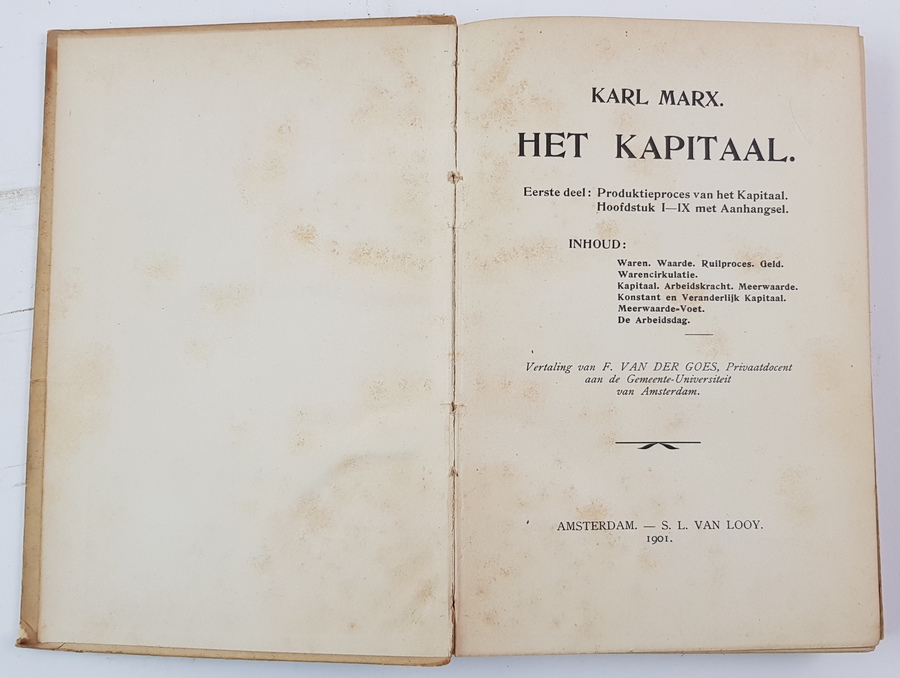 Karl Marx - Het Kapitaal. Hoofdstuk I-IX. Vertaling: F. Van der Goes. Amsterdam: S. L. van Looy, 1901. Hardcover met gekartonneerde platten. Internationale Bibliotheek, deel 17. Eerste Nederlandse vertaling van dit standaardwerk. 258pp, 8vo (20x14 cm). Hierbij: Frans Mehring - Karl Marx. Geschiedenis van zijn Leven. Rotterdam: Brusse, 1921. [Totaal 2]. |