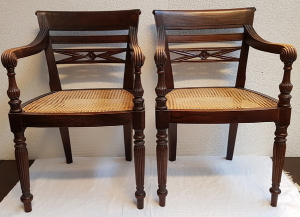 Een stel houten armleunstoelen met webbing zitting, 20 e eeuw. |