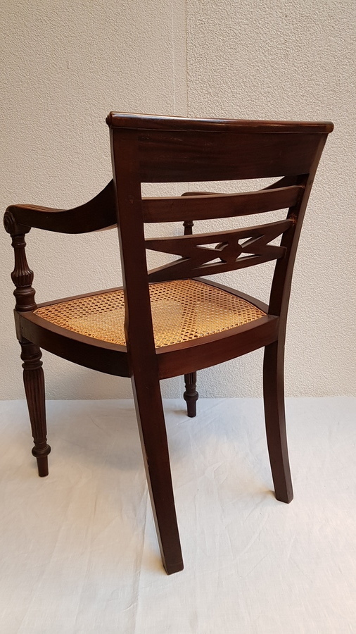 Een stel houten armleunstoelen met webbing zitting, 20 e eeuw.