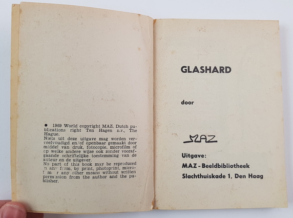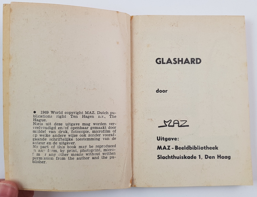 Maz (pseud. Alfred Mazure) - Dick Bos. Glashard. Detective beeldverhaal. Den Haag: Maz-beeldbibliotheek, 1969. Reclameuitgave van J. v. Geuns & Co. |