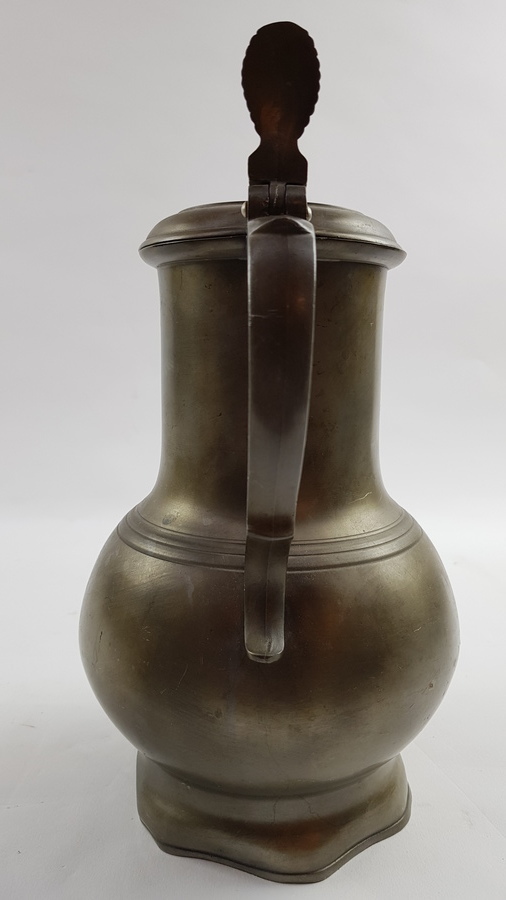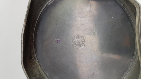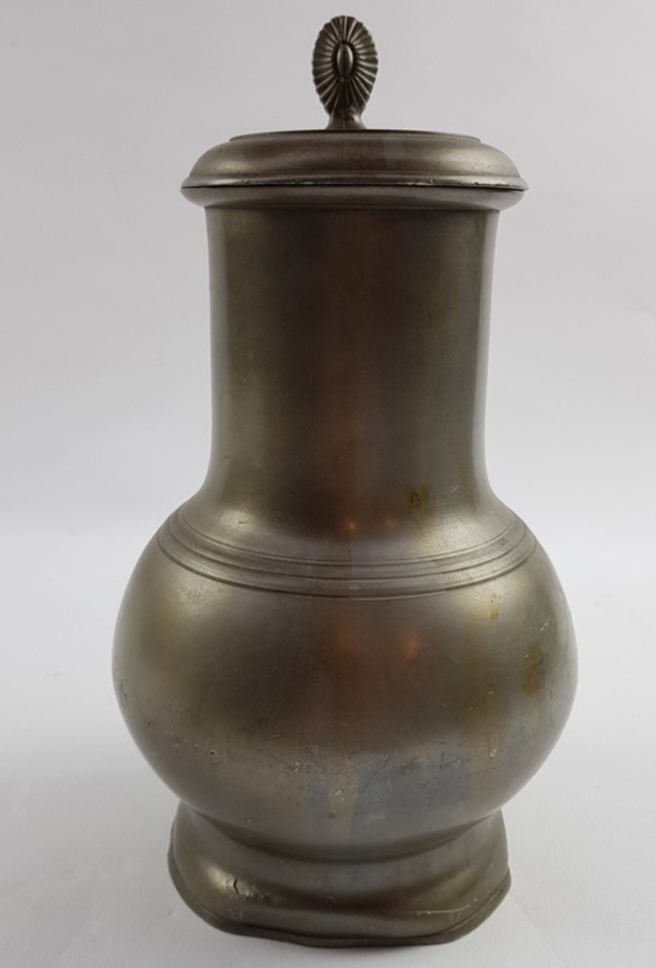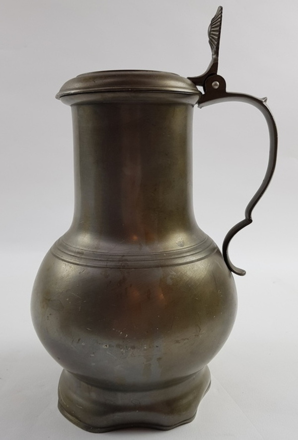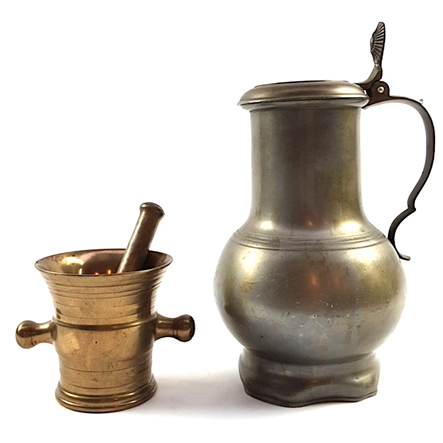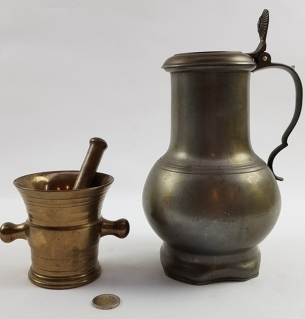 Messing vijzel en een tinnen klepkan, 19e en 20e eeuw. Klepkan met Engelmerk, waarschijnlijk Nederlands |